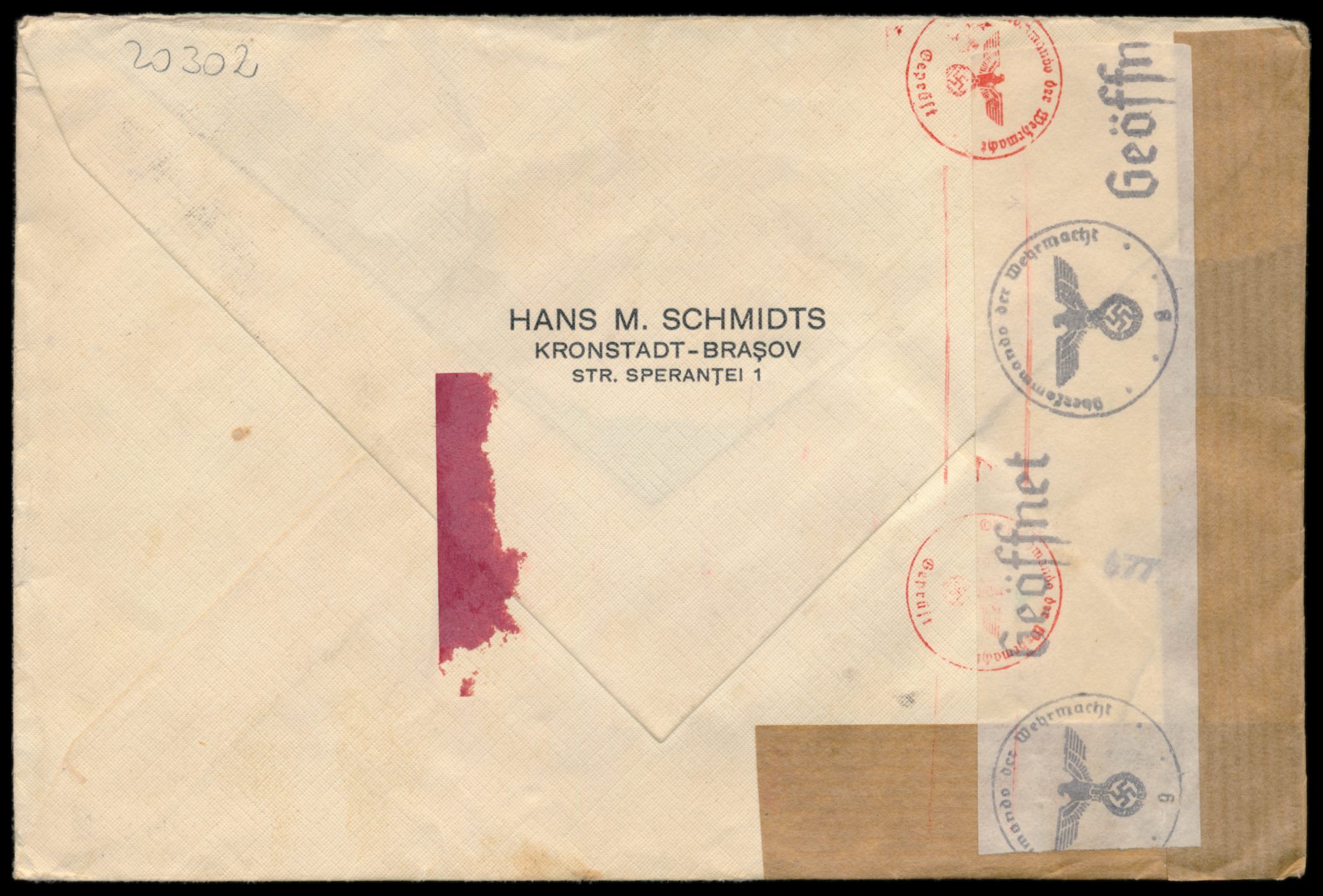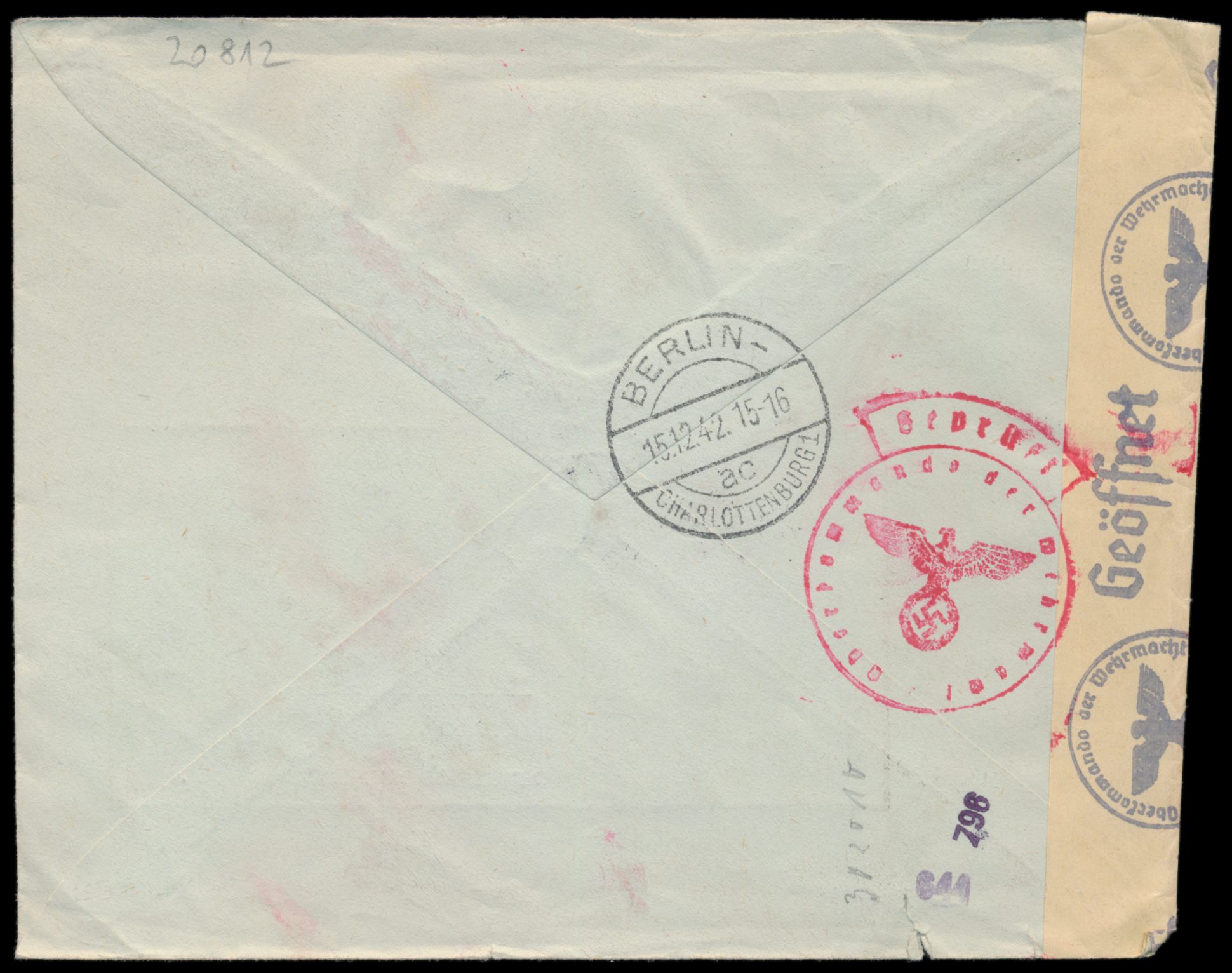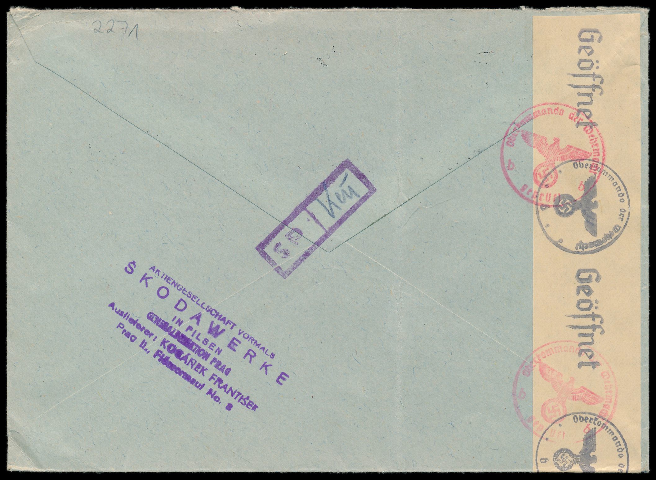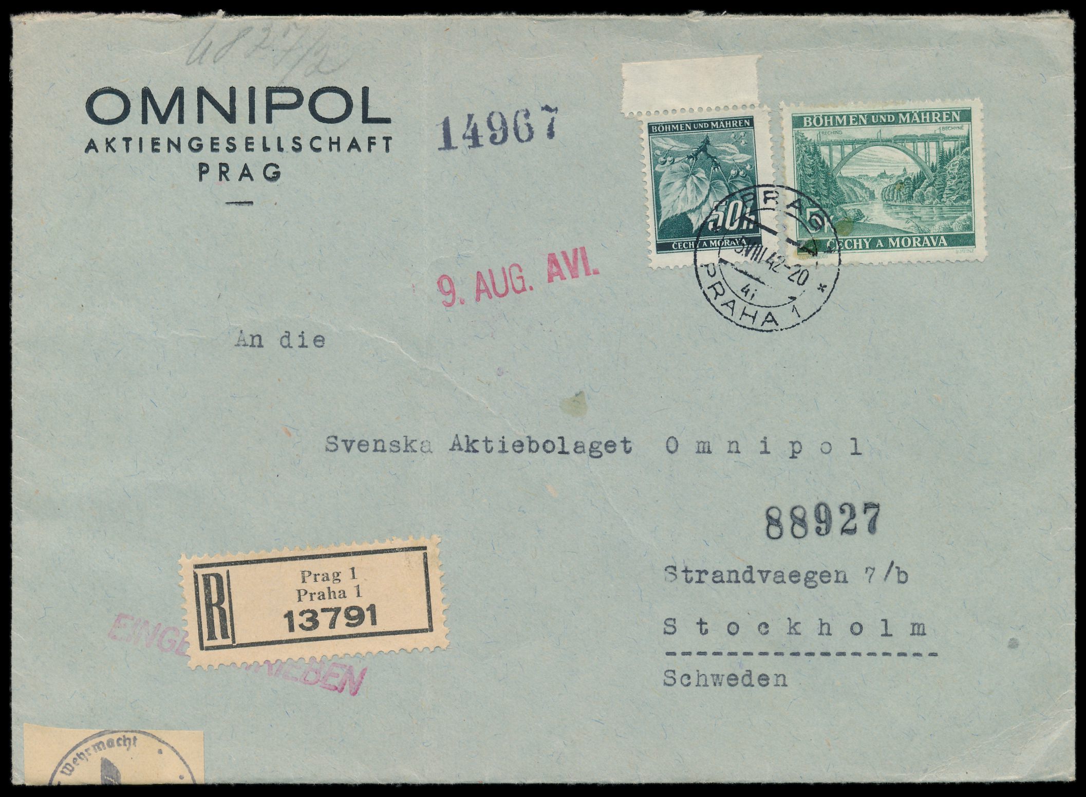 Auslands-Einschreibbrief der Omnipol Aktiengesellschaft in Prag an die schwedische Omnipol-Tochtergesellschaft in Stockholm, Frankatur Böhmen-Mähren 5,50 K., Stempel Prag 1 5.8.42, rückseitig seltener violetter Zensur-Rahmenstempel SP / ..., Landsmann SDP7.1 (= Gruppe F), nur auf Post der Fa. Omnipol bekannt, rückseitig zusätzlich Absenderstempel Skoda-Werke ..., Durchlaufstempel Ab der Zensurstelle Berlin, Firmeneingangsstempel 9.8., senkrechter Mittelbug