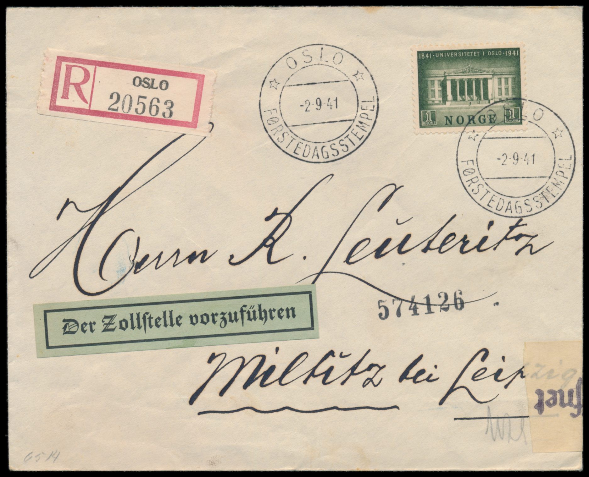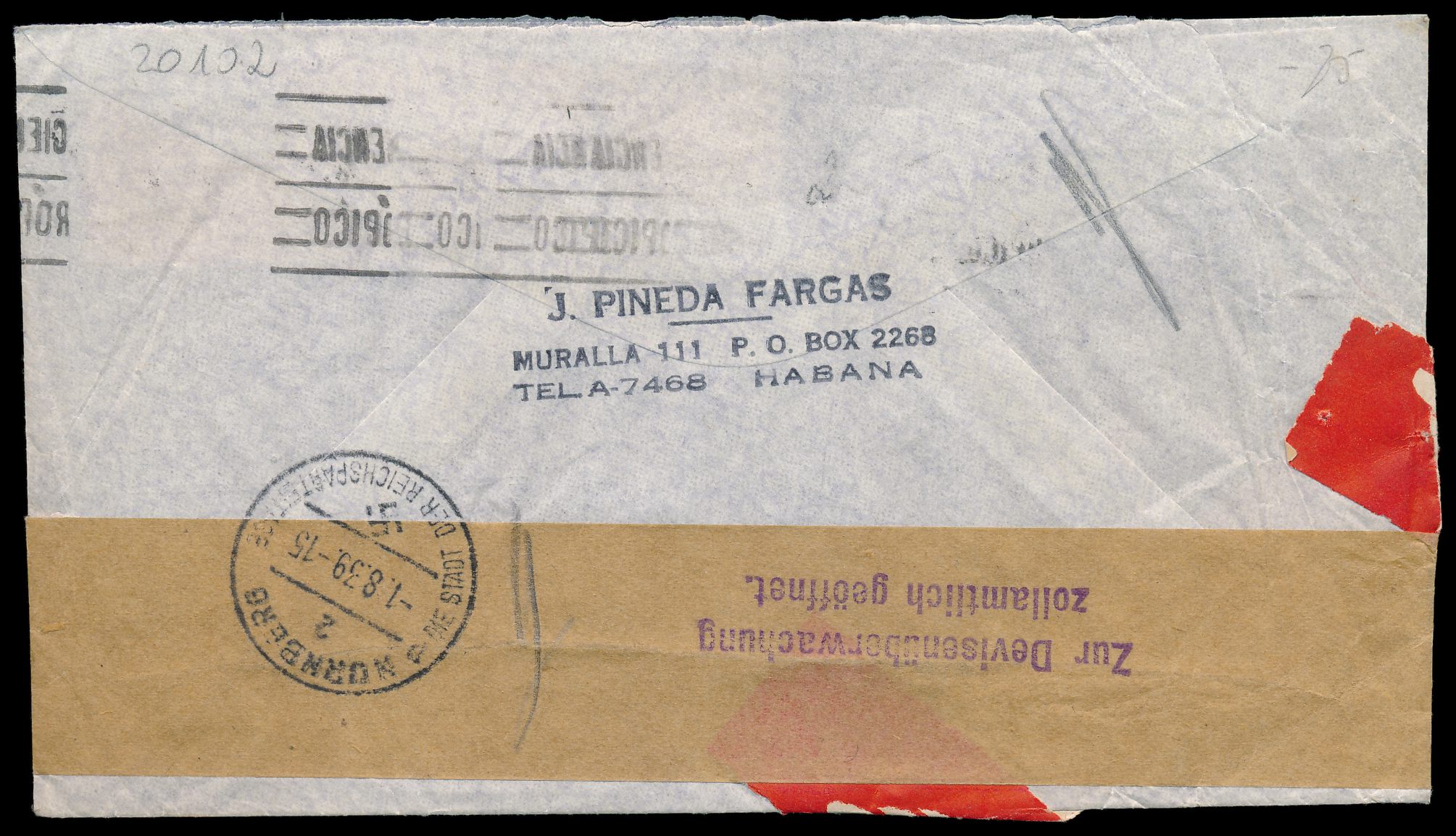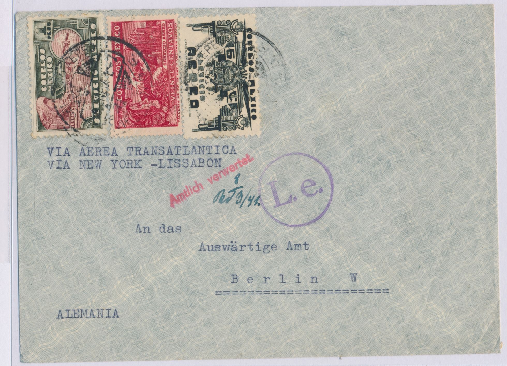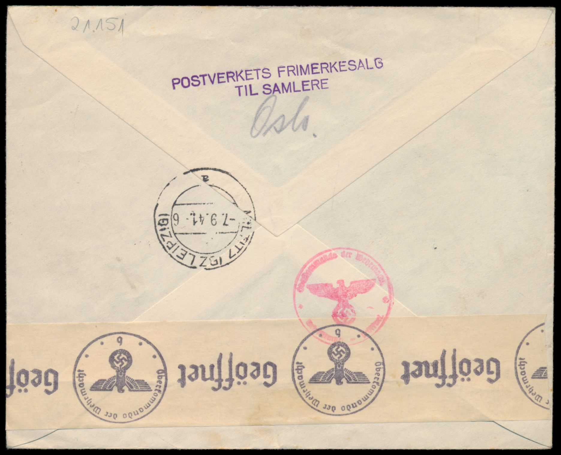 Auslands-Einschreibbrief der Omnipol Aktiengesellschaft in Prag an die schwedische Omnipol-Tochtergesellschaft in Stockholm, Frankatur Böhmen-Mähren 5,50 K., Stempel Prag 1 5.8.42, rückseitig seltener violetter Zensur-Rahmenstempel SP / ..., Landsmann SDP7.1 (= Gruppe F), nur auf Post der Fa. Omnipol bekannt, rückseitig zusätzlich Absenderstempel Skoda-Werke ..., Durchlaufstempel Ab der Zensurstelle Berlin, Firmeneingangsstempel 9.8., senkrechter Mittelbug