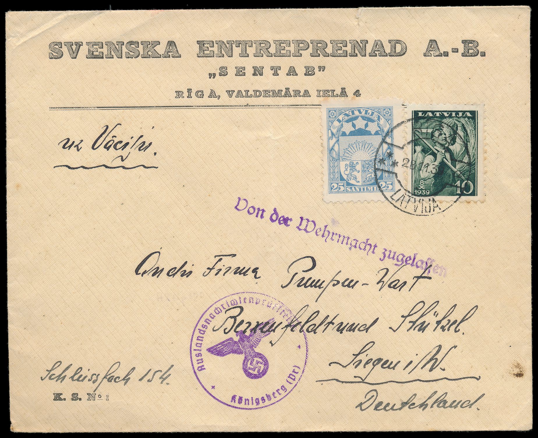 Lettland 10 S. und 25 S. auf Firmenbrief von Riga 28.11.39 nach Deutschland, Zensur Königsberg, violetter L1 "Von der Wehrmacht zugelassen" und Dienstsiegel Auslandsnachrichtenprüfstelle Königsberg (Pr), Landsmann AP1.2 und APZ1.2,schwacher senkrechter Mittelbug, Bedarf