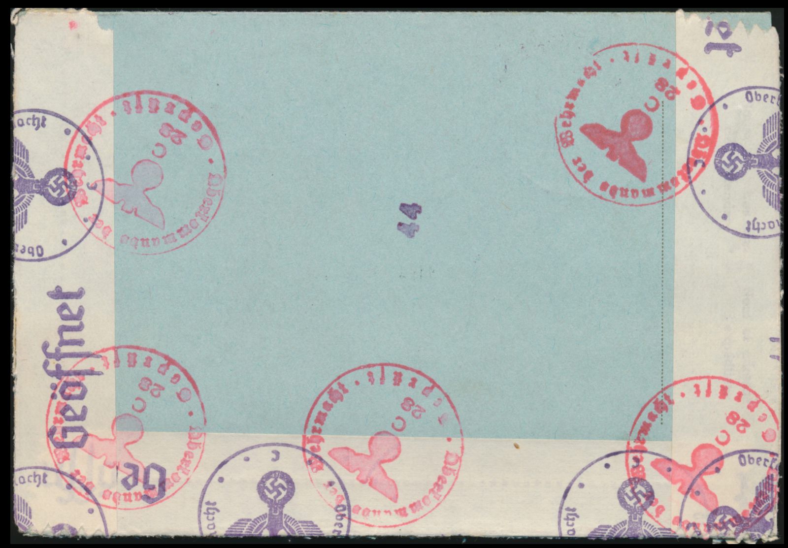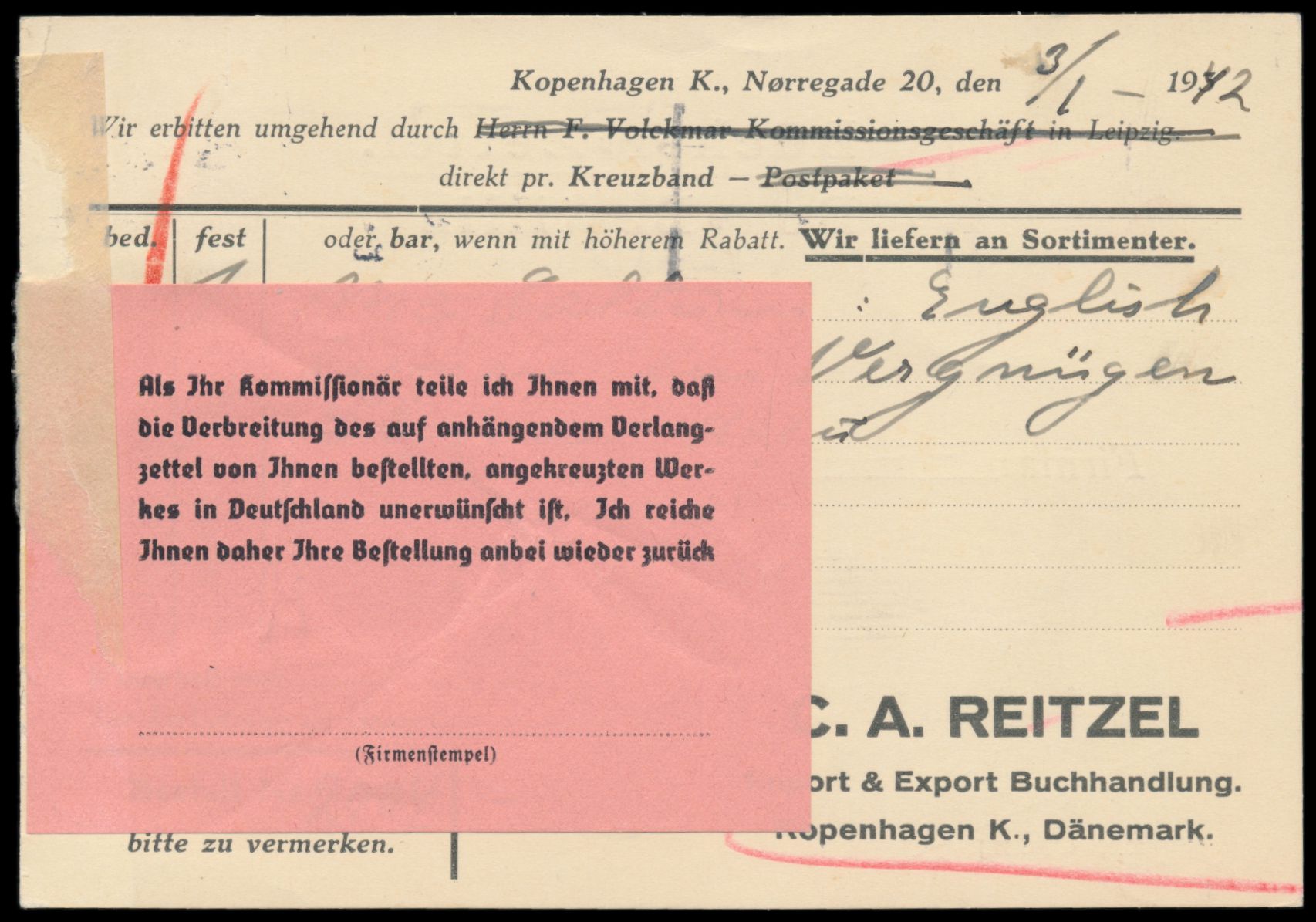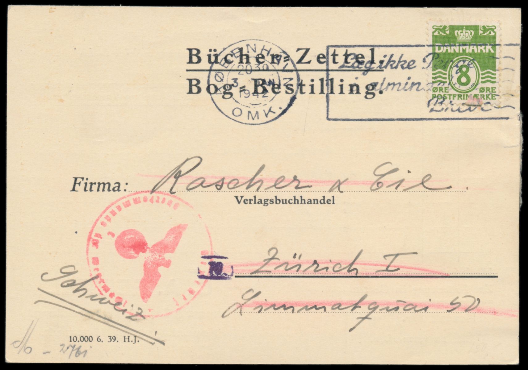 8 Öre auf Karte aus Kopenhagen, Stempel 3.1.42 nach Zürich, Bestellung eines englischen Sprach-Lehrbuches, OKW-Zensur Frankfurt, rückseitig roter Beanstandungszettel "bestelltes Werk ist in Deutschland unerwünscht...," Bestellung wieder zurück, seltener Beleg eines Versuchs die Zensur zu umgehen