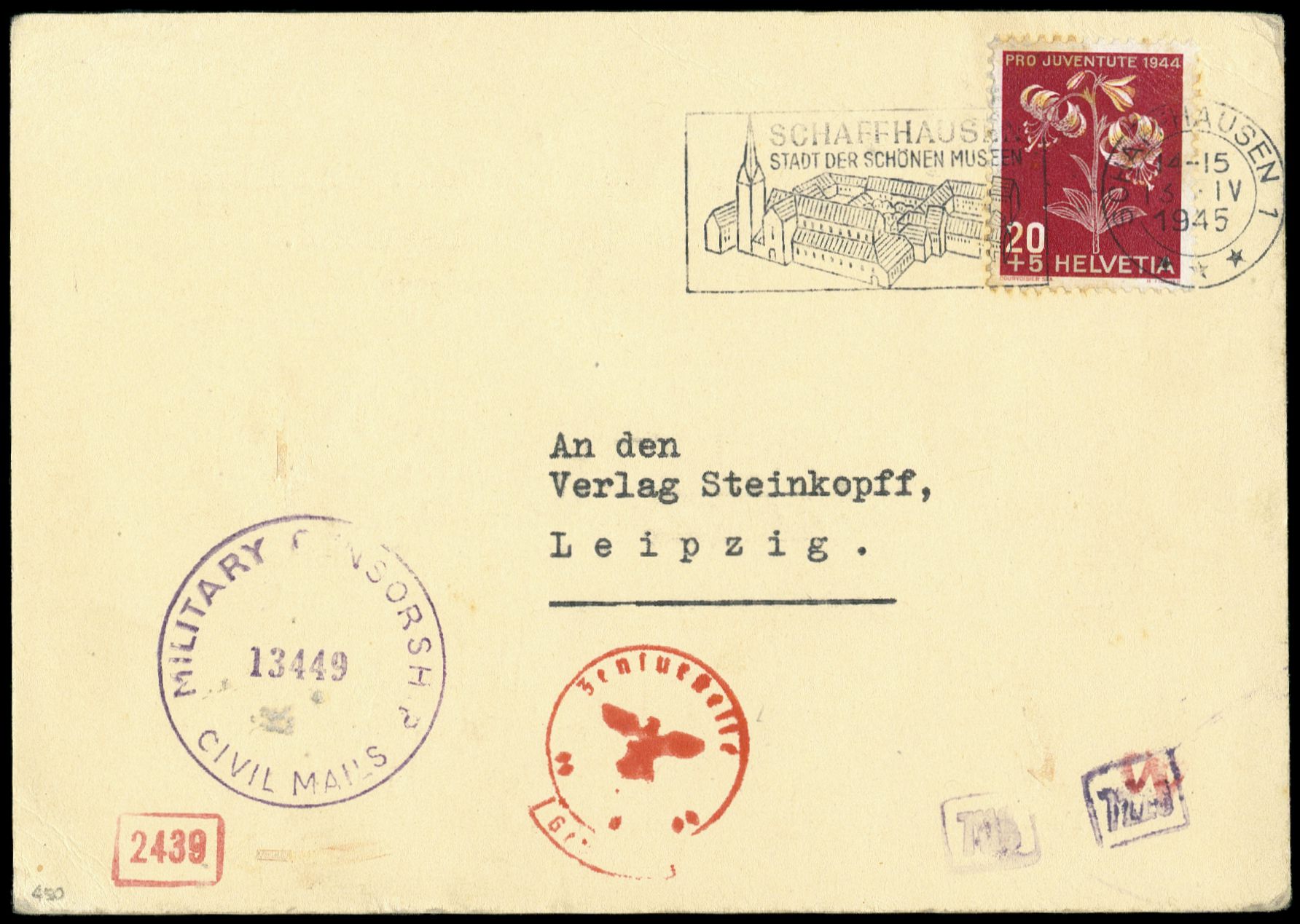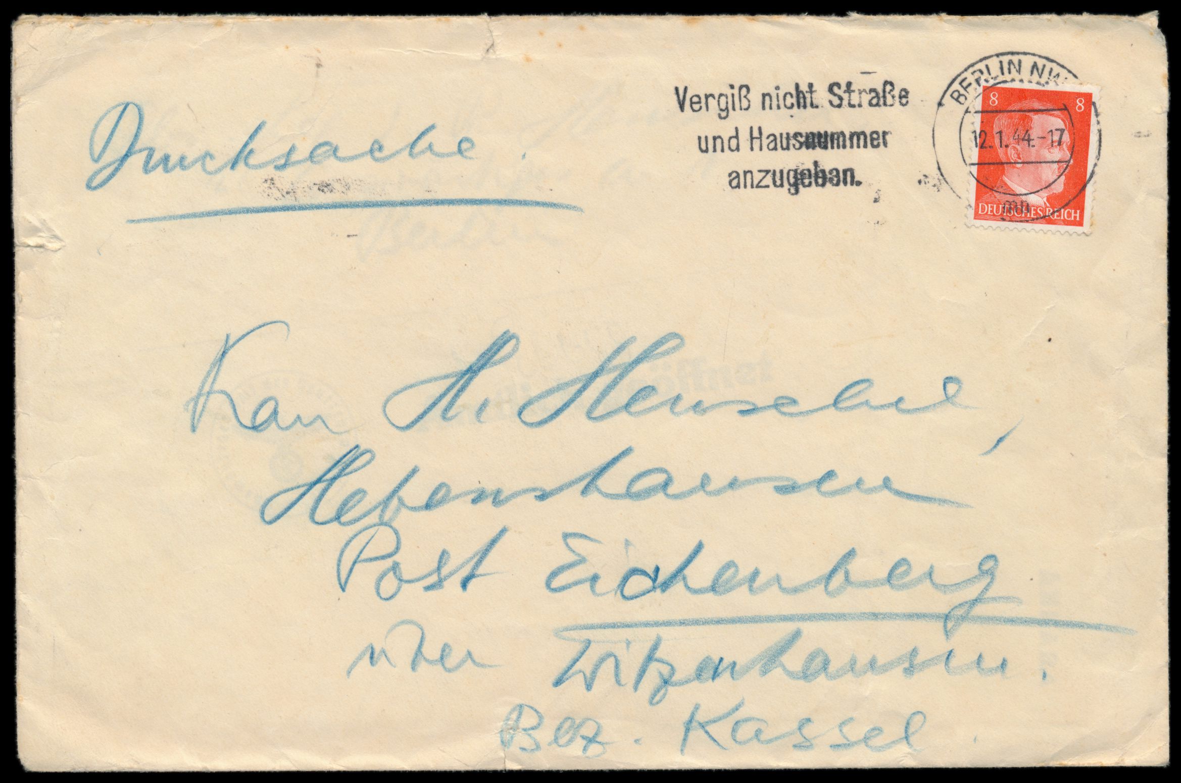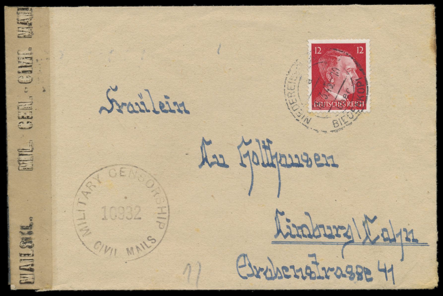 12 Pf. Hitler auf Brief mit Stempel Niedereisenhausen über Biedenkopf 15.3.45 nach Limburg / Lahn, "überrollt", links Zellophanverschluß und Zensurstempel mit Nr. 10932 der US-Zensurstelle Offenbach, rückseitig handschriftlicher Eingangsvermerk 12.11.45