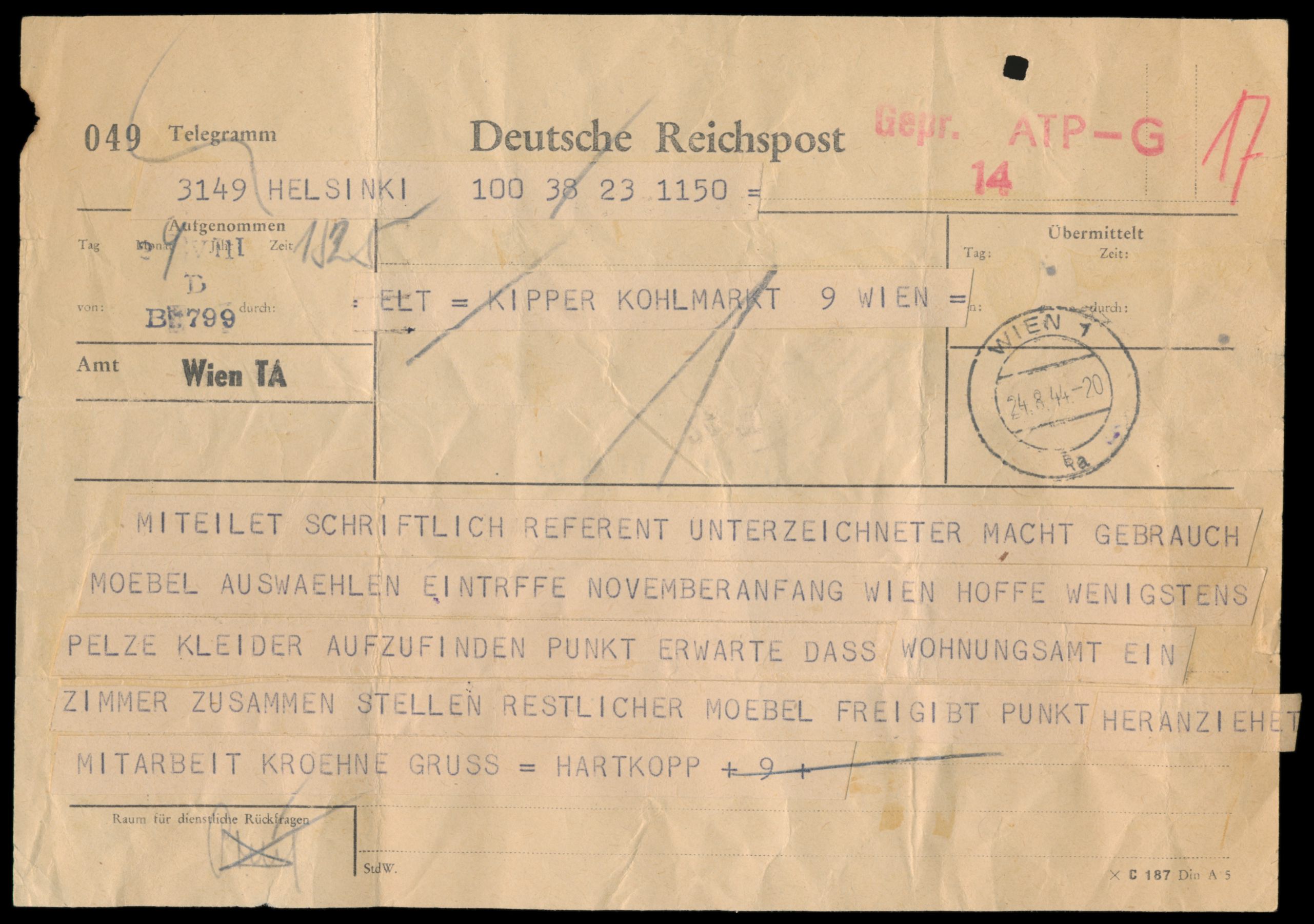 Aufnahmeformular für ein Telegramm von Helsinki nach Wien, roter L2 Gepr. ATP - G / 14 der Telegramm-Zensurstelle Wien, Tagesstempel Wien 1 24.8.44