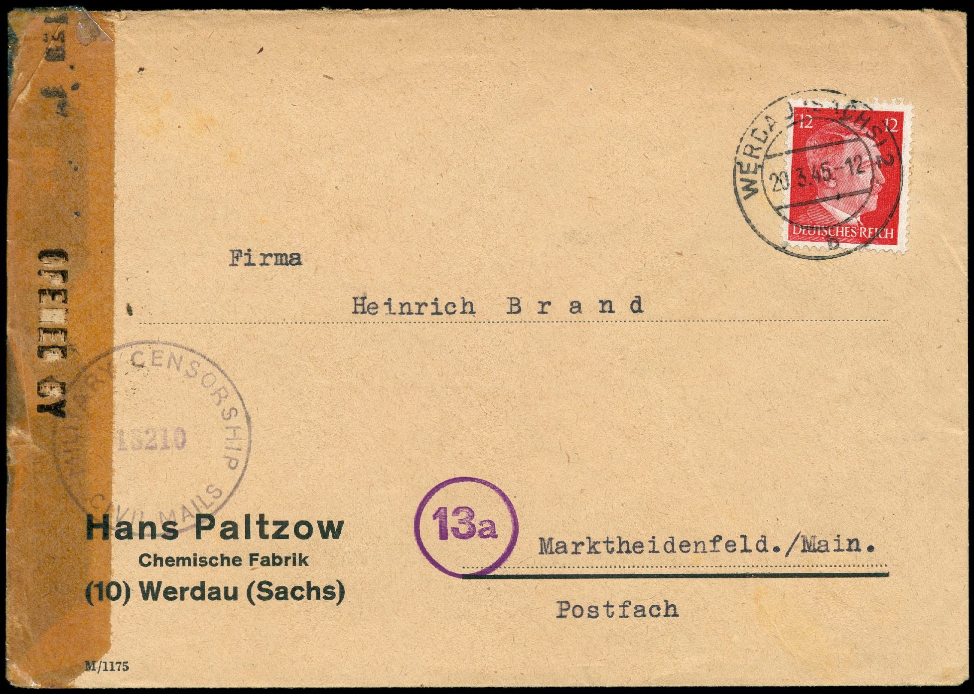 Firmenbrief mit Stempel Werdau (Sachs) 2 20.3.45 nach Marktheidenfeld, "überrollt", links Zellophanverschluß und Zensurstempel mit Nr. 13210 der US-Zensurstelle München