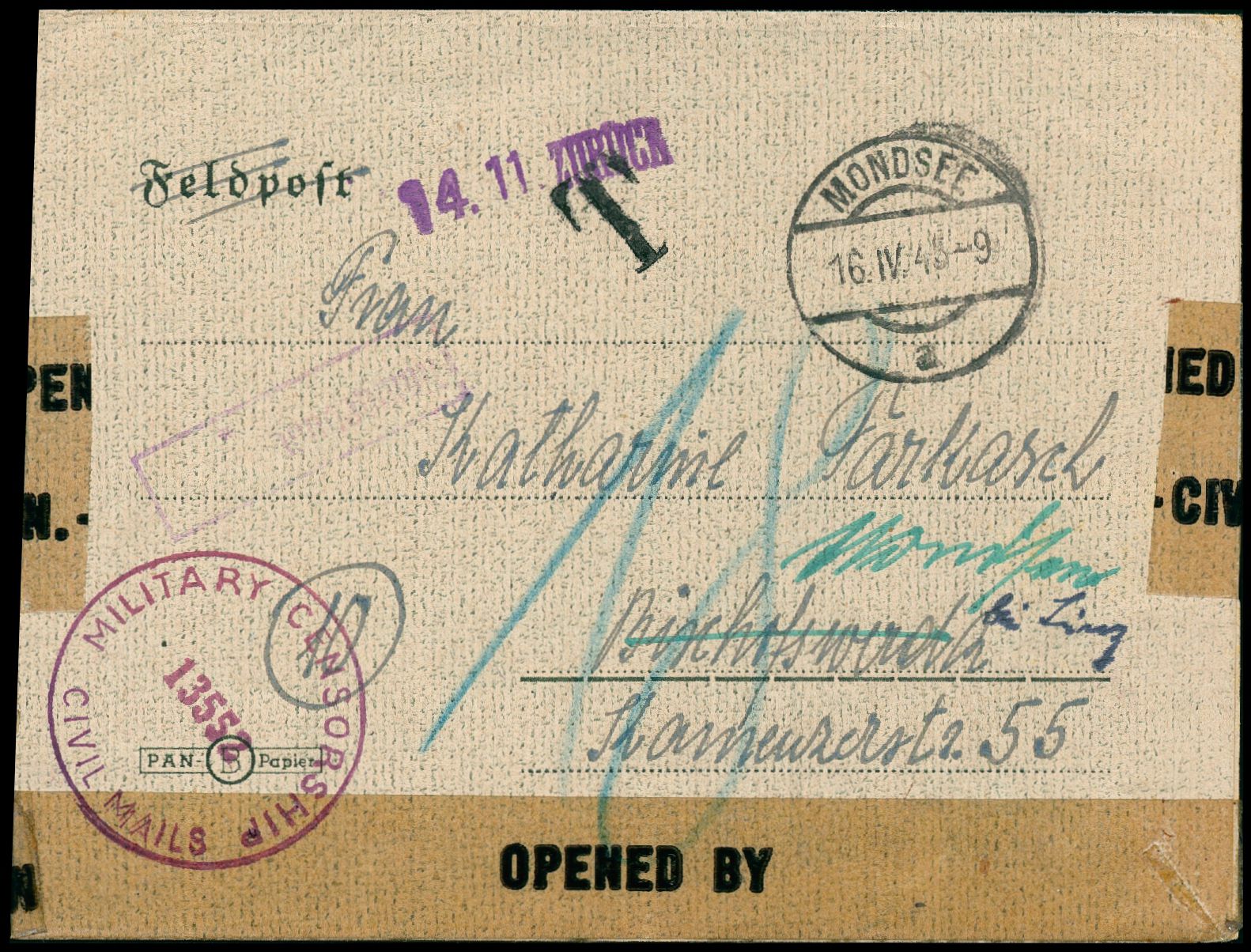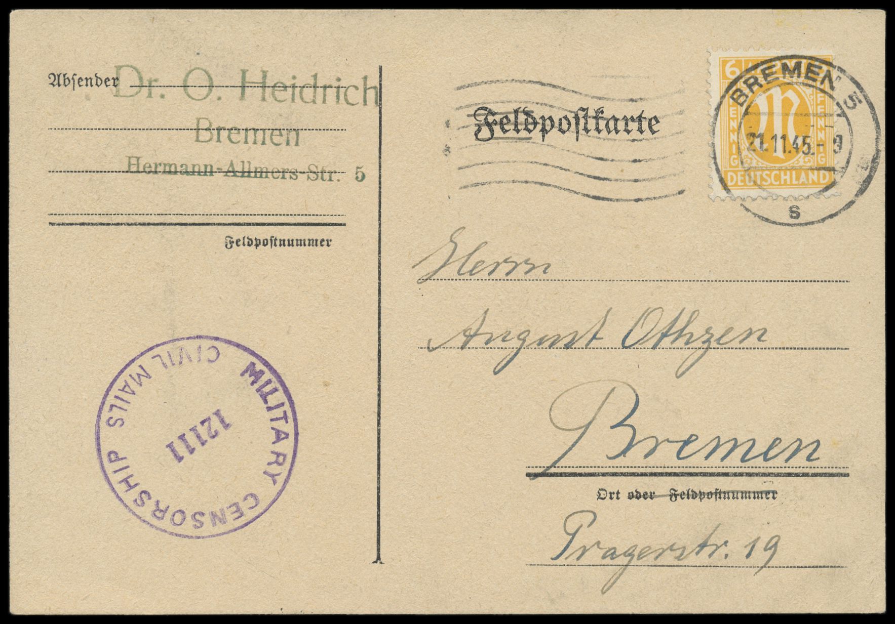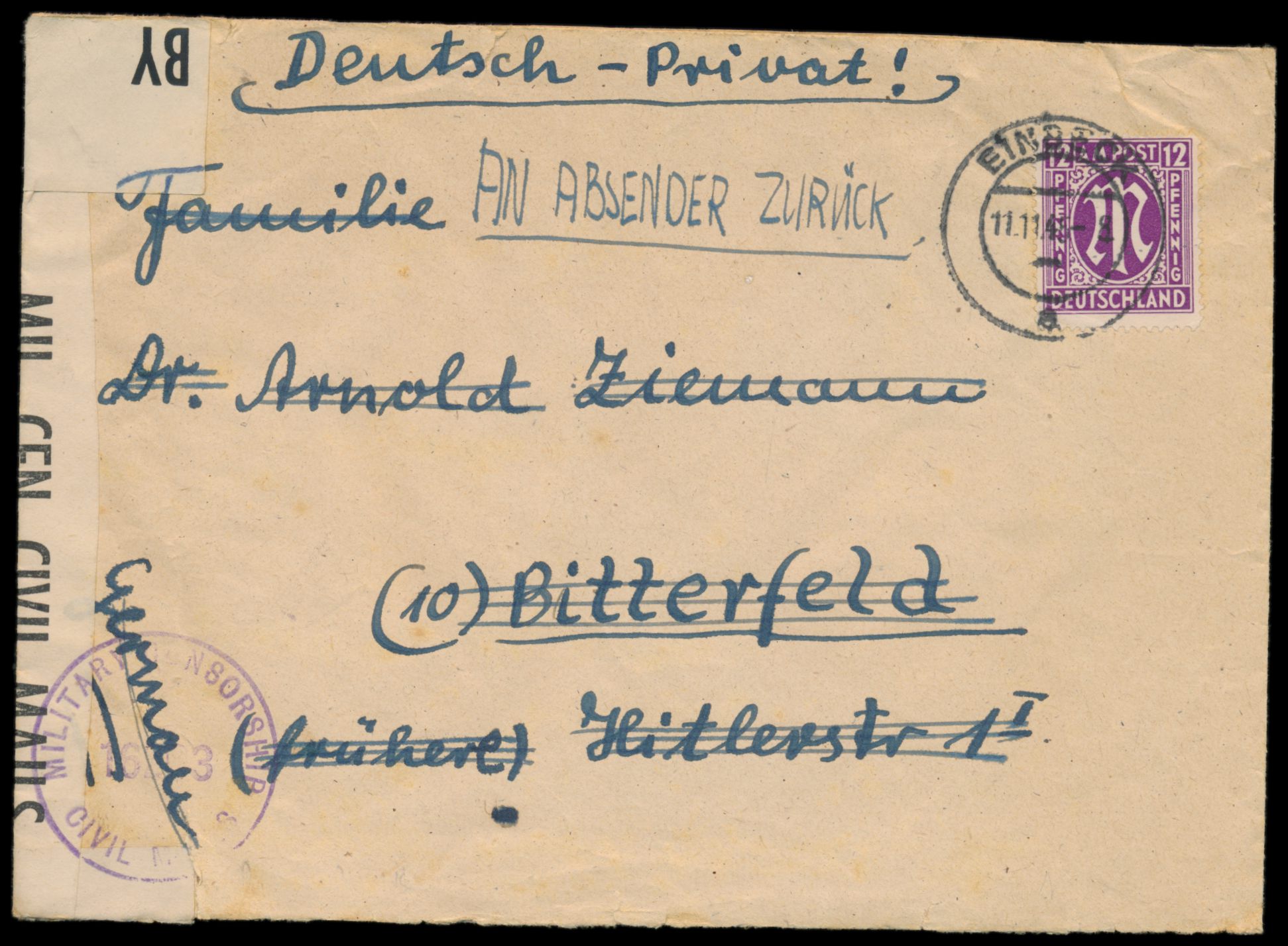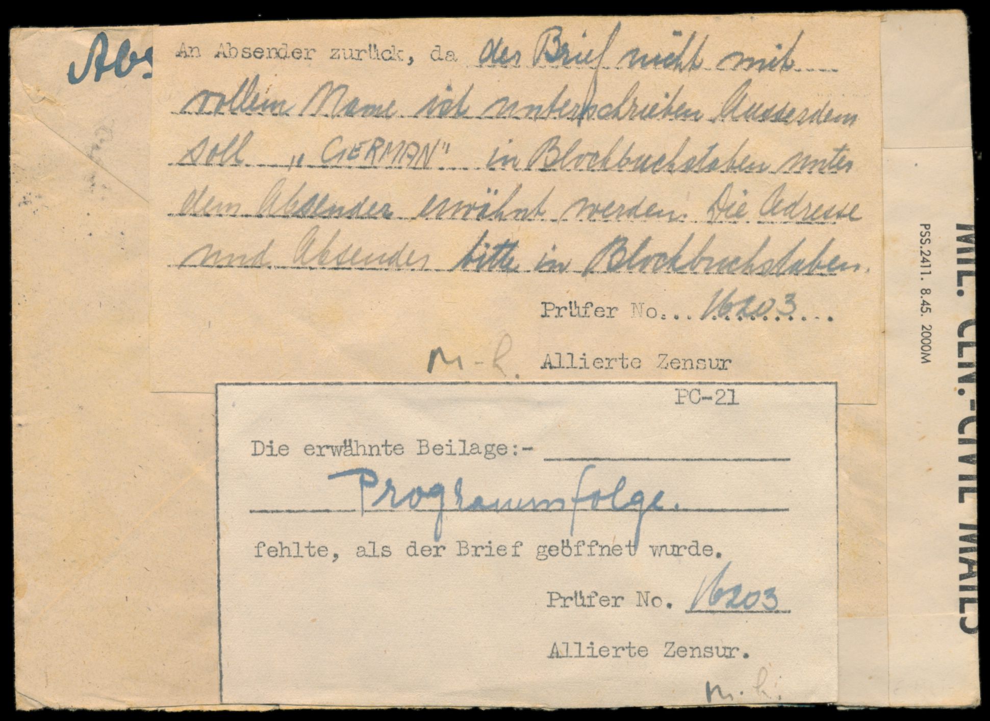 Brief mit AM-Post 12 Pf., Stempel Einbeck 11.11.45, nach Bitterfeld, links britischer Zensurverschluß und Zensurstempel mit Nr. 16203. Zensurstelle Peine, rückseitig zwei Zensur-Einlagezettel aufgeklebt: "An Absender zurück, da ... Prüfer No. ... Alliierte Zensur" , handschriftlich mehrere Verstoßgründe und Zensor-Nr. 16302 und "Die erwähnte Beilage ... fehlte als der Brief geöffnet wurde ..." , Form-Nr. PC-21, ebenfalls mit handschriftlicher Ergänzung und Zensor-Nr. 16203