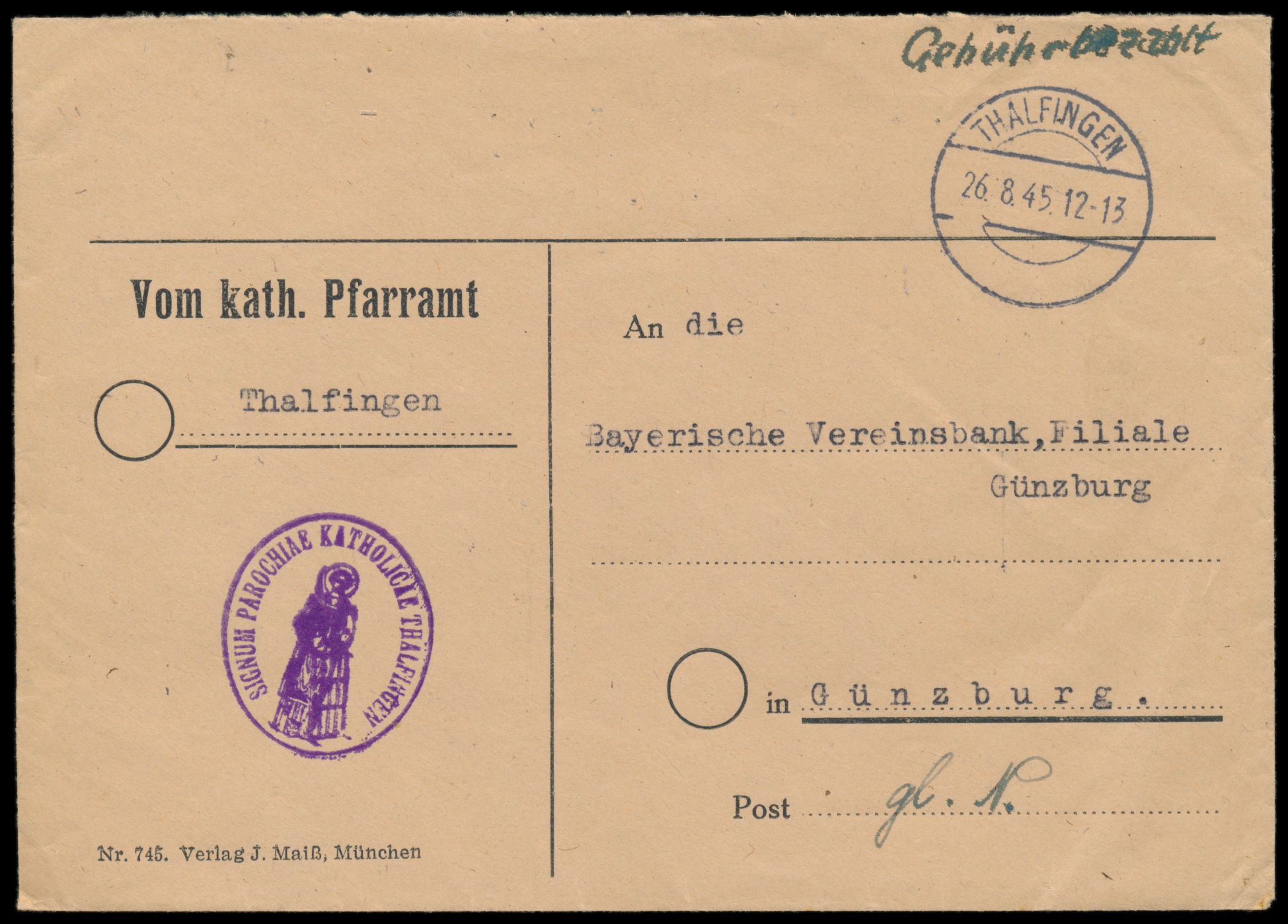 Behördenbrief mit Stempel Thalfingen 26.8.45 nach Günzburg, handschriftlich Gebühr bezahlt, rückseitig Zensurstempel der lokalen Zensurstelle Neu-Ulm "... Ist Lieut. CAC" und faksimilierte Unterschrift