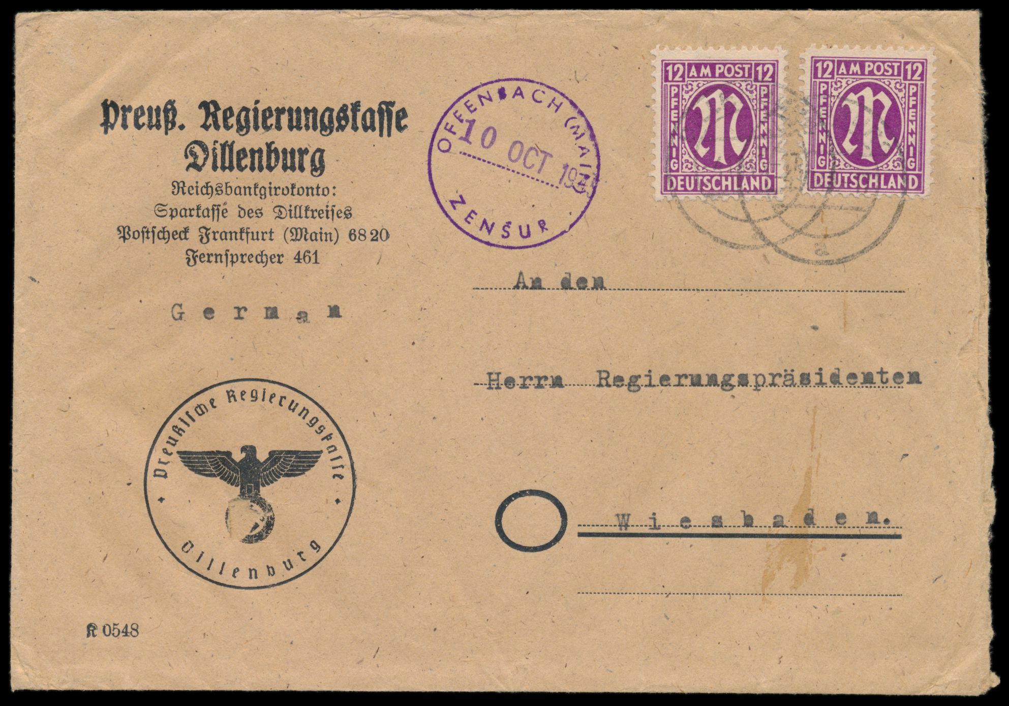 2 x 12 Pf. AM-Post auf Behördenbrief 2. Gewicht, Stempel Dillenburg 4.10.45 nach Wiesbaden, seltener Durchlaufstempel Offenbach (Main) / Zensur und Datum-L1 10. Oct. 1945, Bedarf