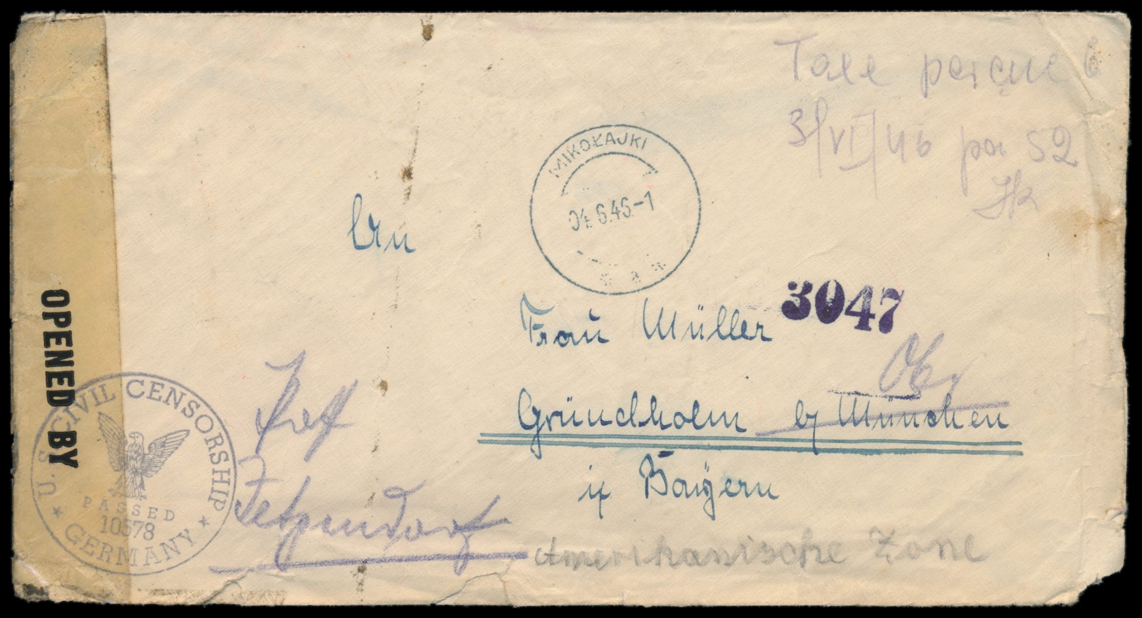 umgearbeiteter deutscher Stempel Mikolajki 4.6.46 (ehemals Nikolaiken) und handschriftlichem Vermerk "Taxe percue" auf Brief nach Deutschland, Absenderangabe "... Polnische Zone ", polnischer Zensur-Nummernstempel 3047, links US-Zellophanverschluß und Zensurstempel mit 10578 von München, Beförderungsspuren und leichte Öffnungsmängel. Belege der verbliebenen deutschen Bevölkerung im polnischen Teil Ostpreußens sind selten.