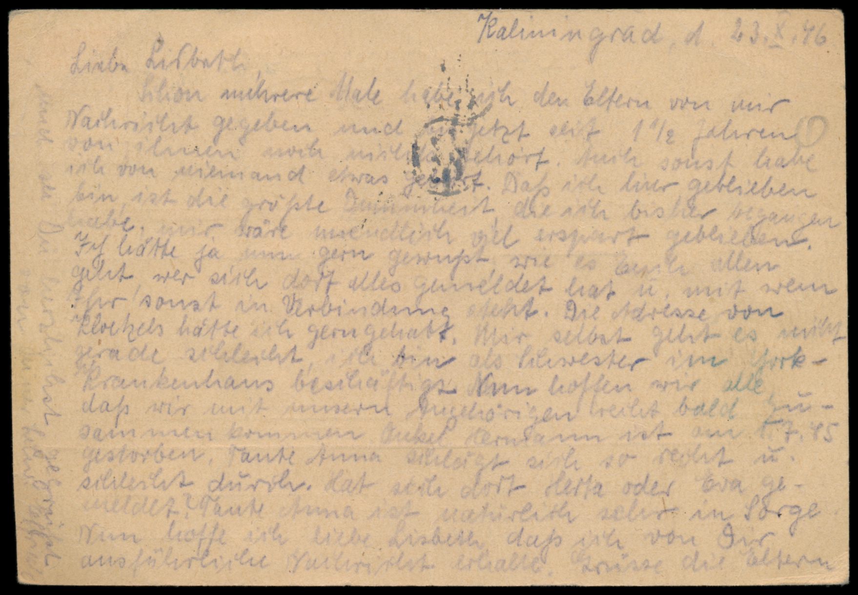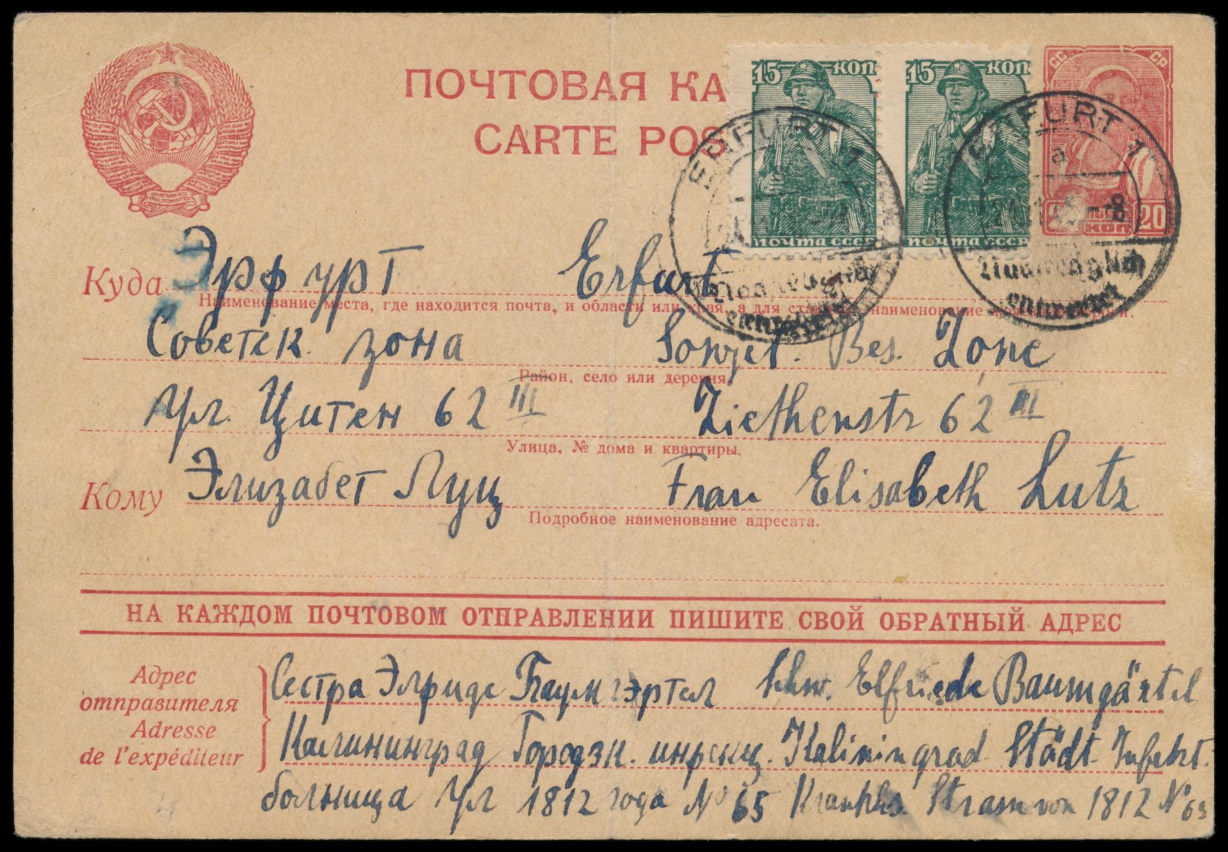 UdSSR-Ganzsache 20 Kop. (kleine Schürfung im Wertstempel) mit 2 x 15 Kop. nach Erfurt, Absenderangabe "Schw. Elfriede Baumgärtel, Kaliningrad, Städt. Infekt. Krankenhaus ...", Stempel Erfurt 1 Nachträglich entwertet 24.11.48, geschrieben in Kaliningrad, d. 23.10.46", zeitgeschichtlich interessanter Text: "... Das ich hier geblieben bin, ist die größte Dummheit, die ich bisher begangen habe, mir wäre unendlich viel erspart geblieben ... ich bin als Schwester im York-Krankenhaus beschäftigt ...", Karte ist senkrecht gefaltet