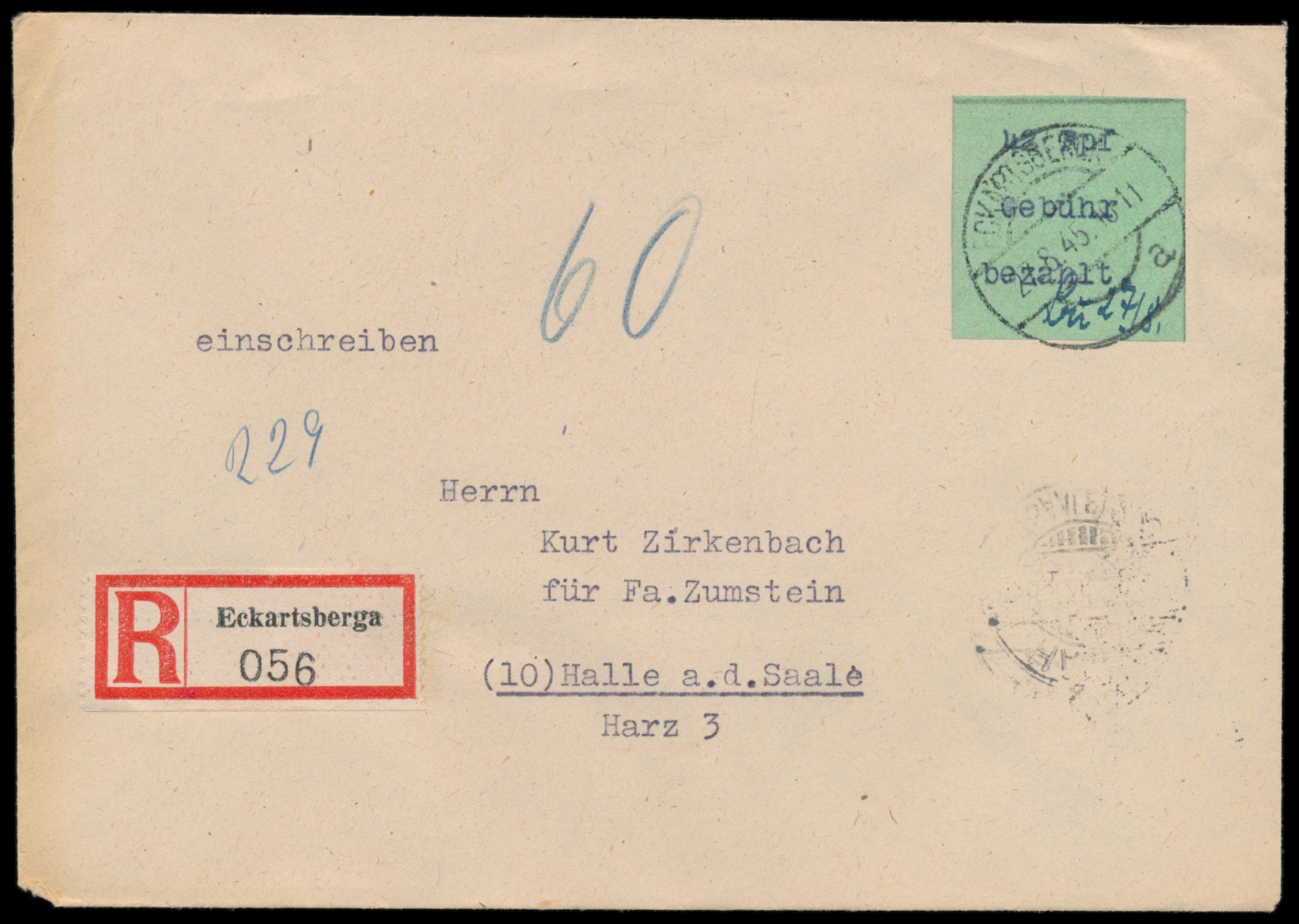 Eckartsberga, Gebührenzettel 42 Pf. mit Signum "Bu" auf philatelistischen Einschreibbrief mit Stempel Eckartsberga 27.8.45 an Zirkenbach in Halle, Ankunftstempel 30.8.45