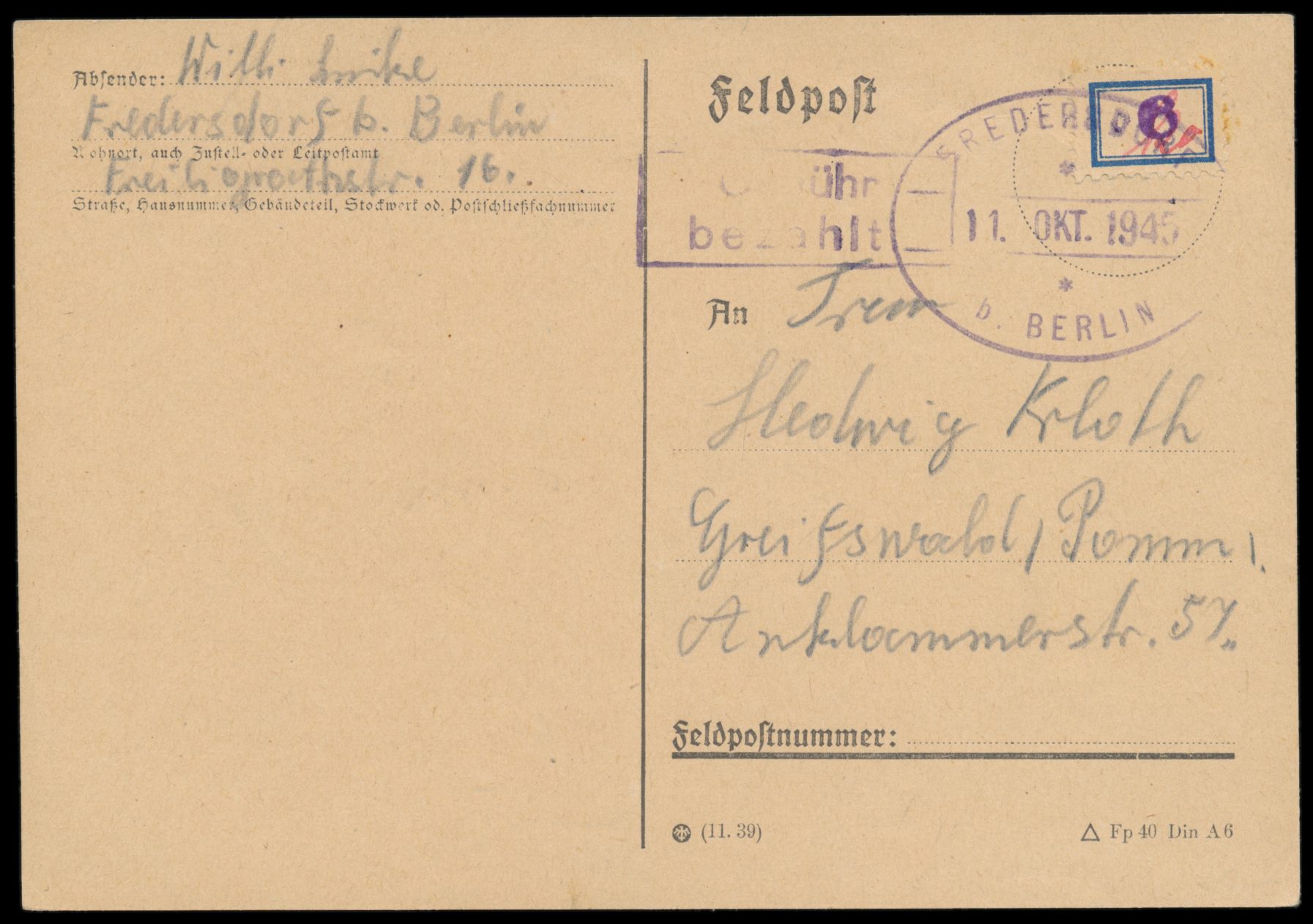 Fredersdorf, Etikette 6 Pf. mit Signum auf Postkarte nach Greifswald, Ovalstempel Fredersdorf b. Berlin 11. Okt. 1945 und R2 Gebühr bezahlt, seltener Bedarf
