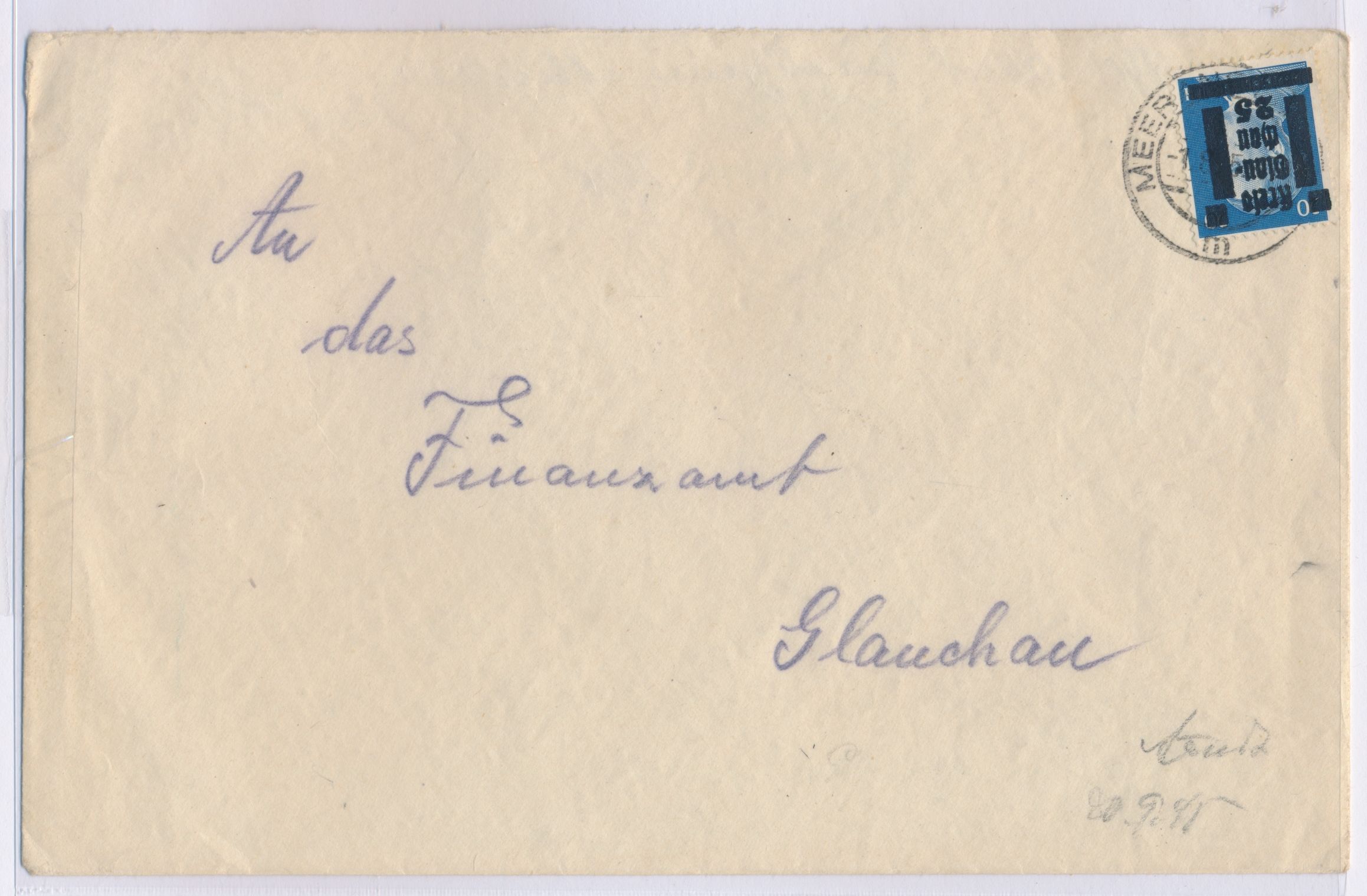Glauchau, Einzelfrankatur 25 Pf. auf 20 Pf. auf Brief mit Stempel Meerane 1.8.45 an das Finanzamt Glauchau, Bedarf