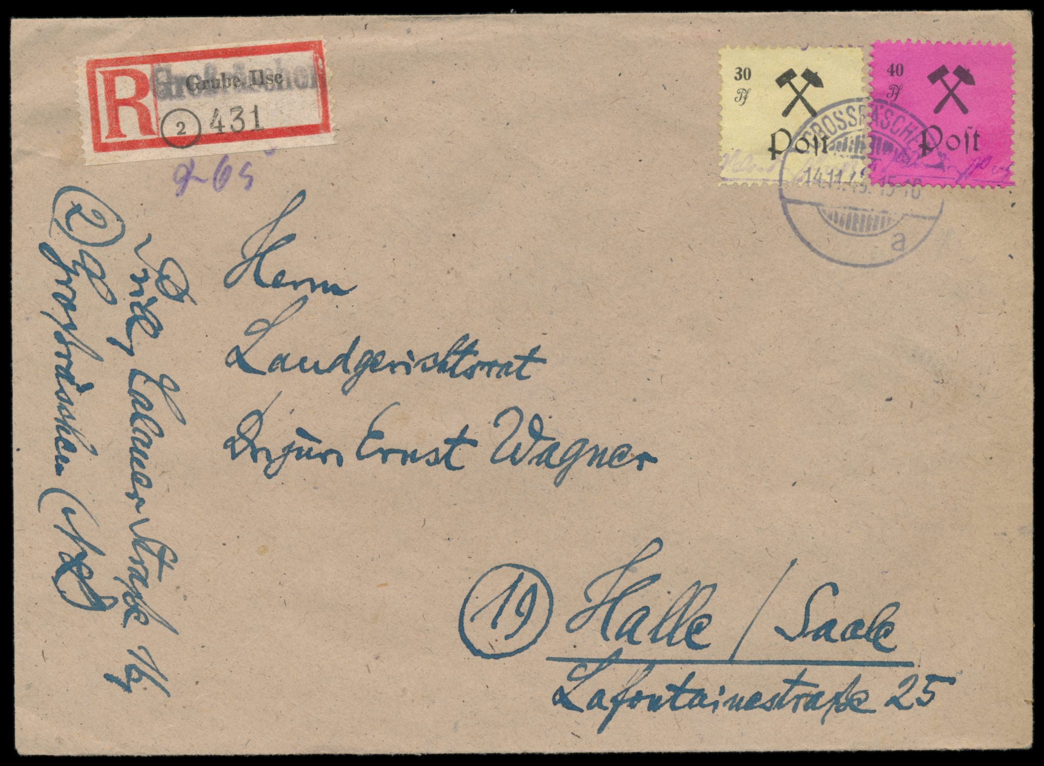Großräschen, 30 Pf. (Type I) und 40 Pf. (Type I) auf Einschreibbrief mit Gitterstempel Grossräschen a 14.11.45 nach Halle, R-Zettel "Grube Ilse" mit L1 überstempelt, Ankunftstempel 16.11.45