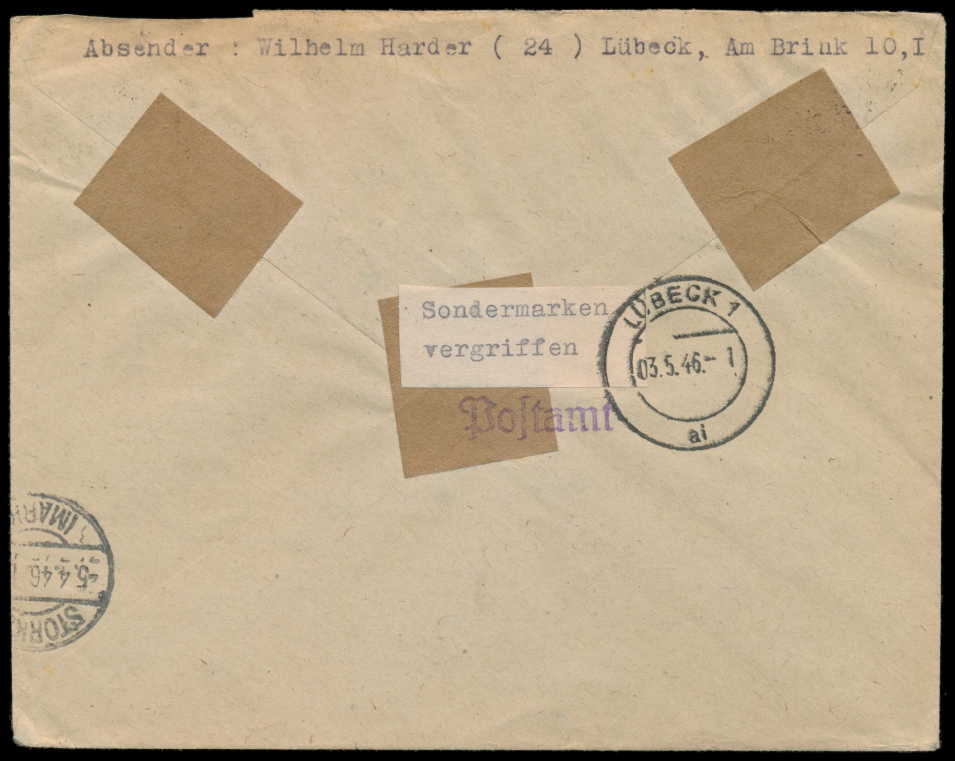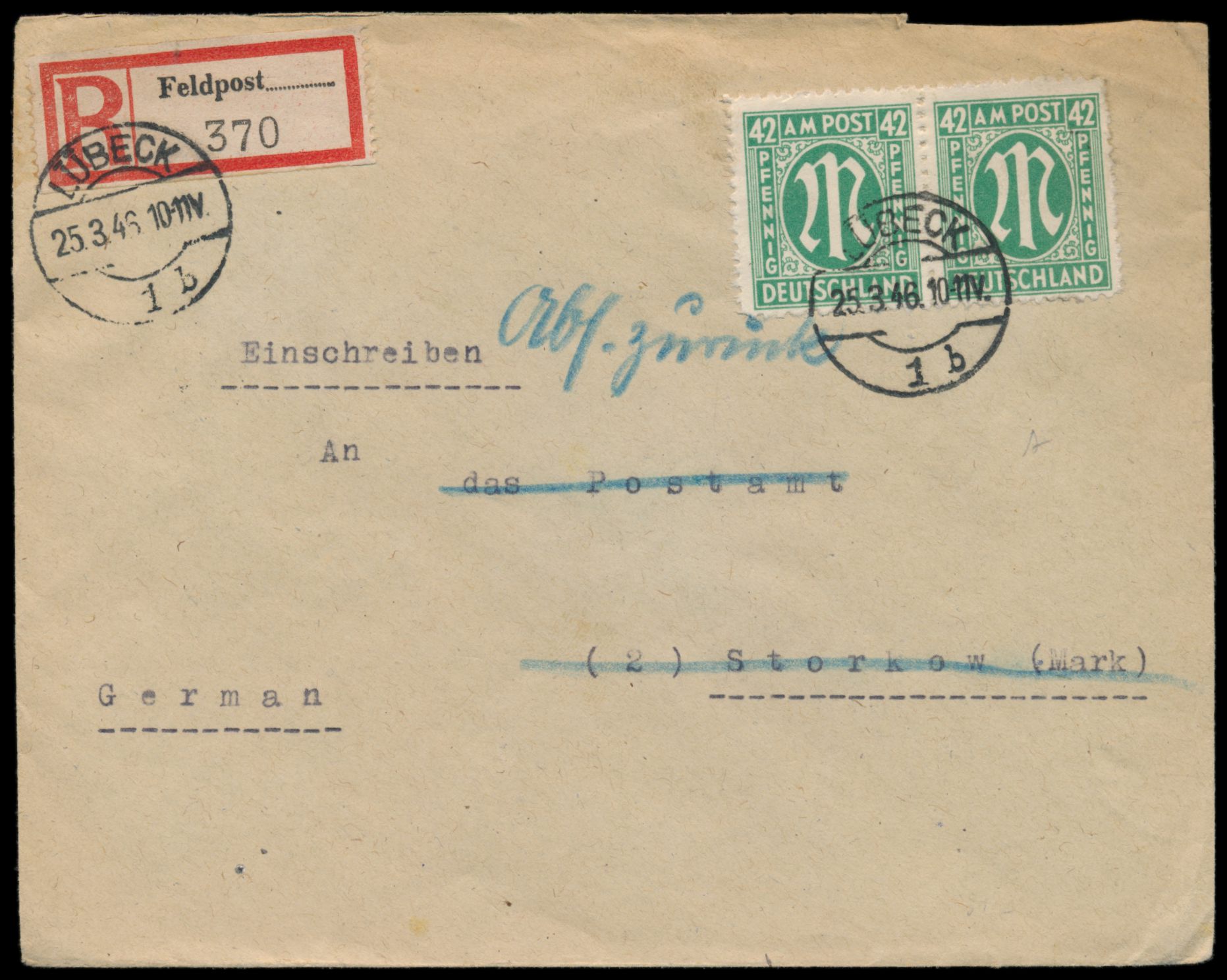 Storkow, 2 x 42 Pf. AM-Post auf Einschreibbrief aus Lübeck 25.3.46 an das Postamt Storkow, Ankunftstempel Storkow 5.4.46, Aufkleber "Sondermarken vergriffen" und L1 Postamt, an Absender zurück, Ankunftstempel 3.5.46