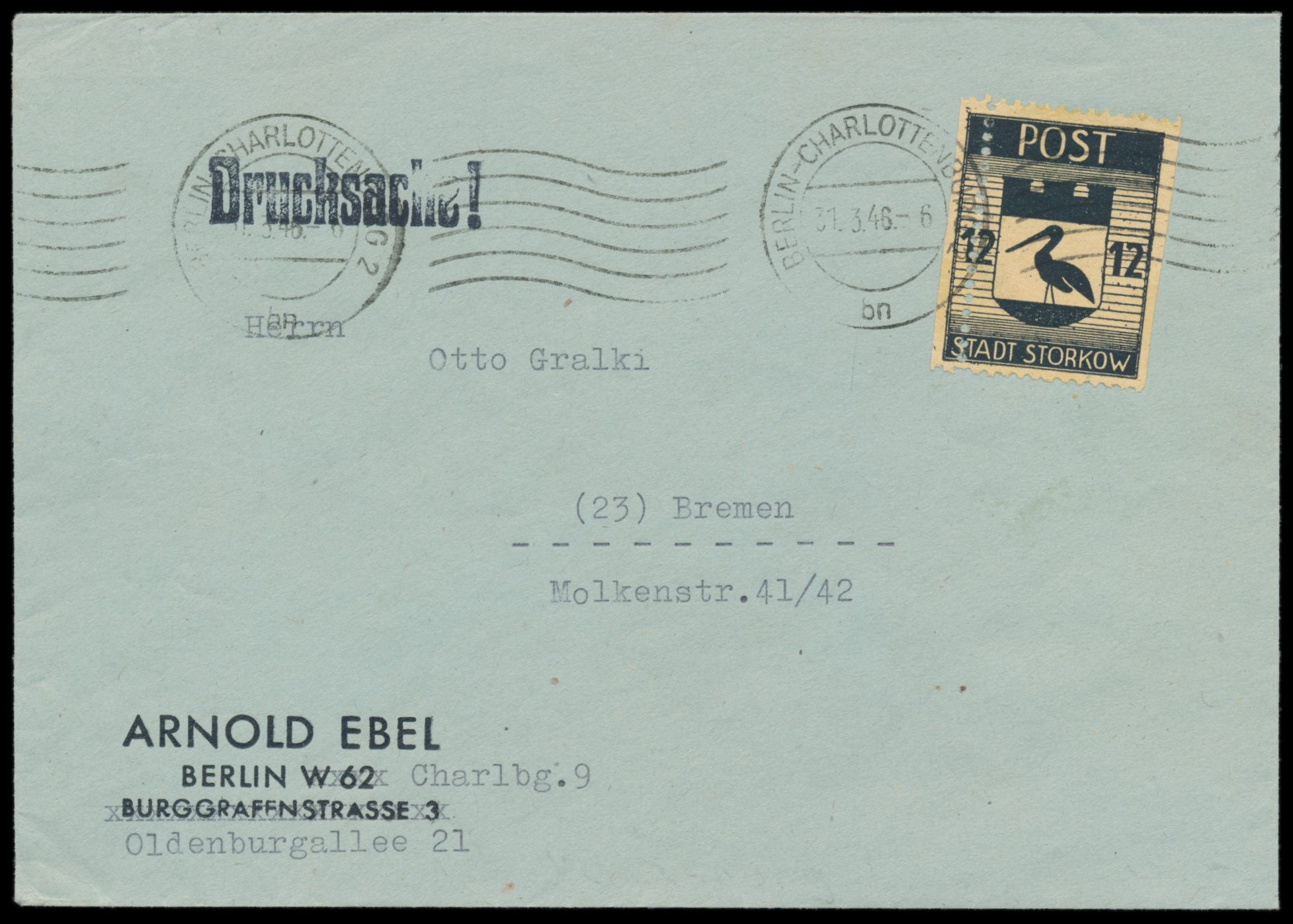 Storkow, 12 Pf. fehlgezähnt und senkrecht entlang des Markenbildes mit Scherenschnitt auf Drucksache, Maschinenstempel Berlin-Charlottenburg 2 31.3.46, nach Bremen
