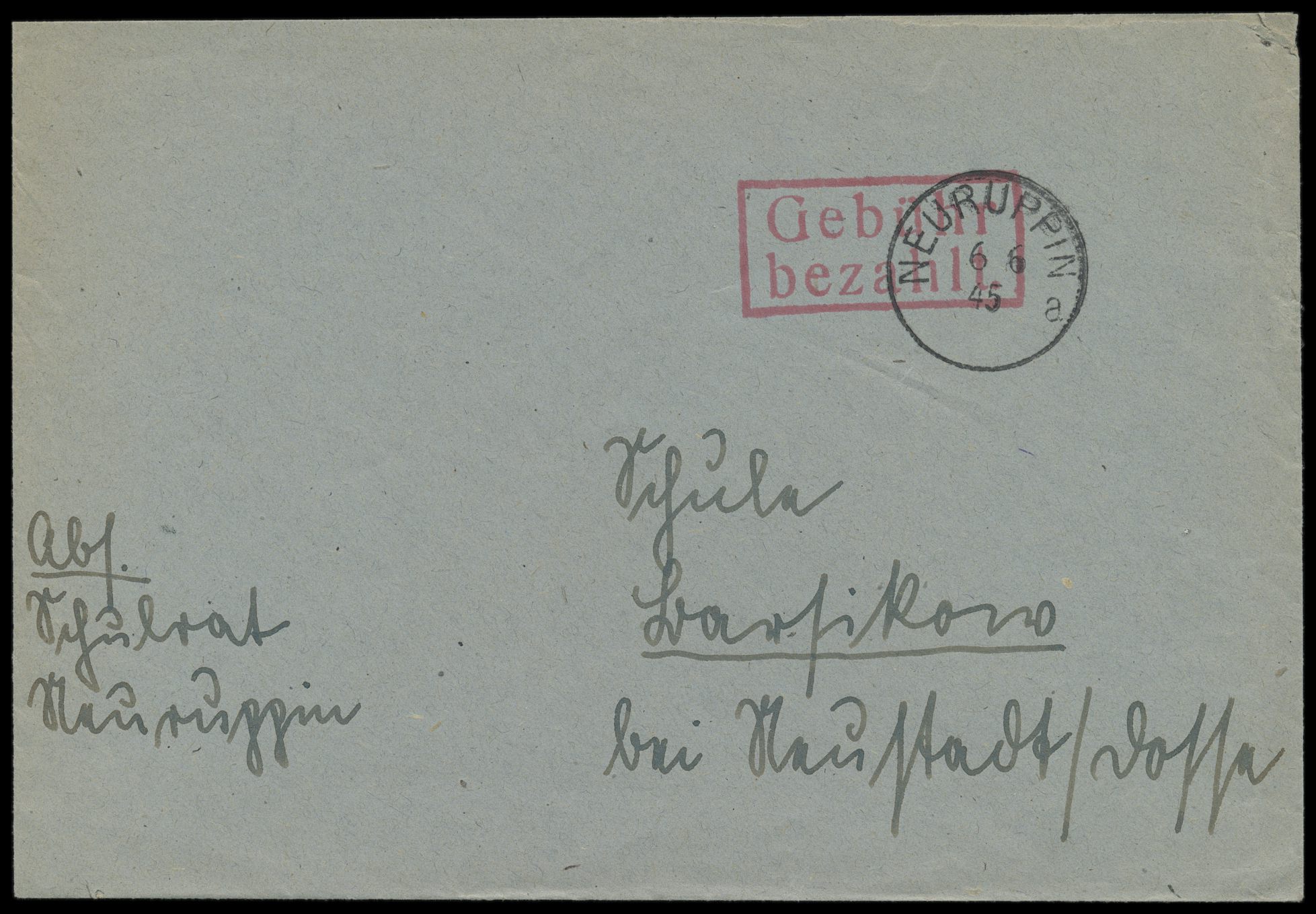 früher Brief mit altem Reichspost-K1 Neuruppin a 6.6.(1945) und rotem R2 Gebühr bezahlt nach Barsikow, Bedarf