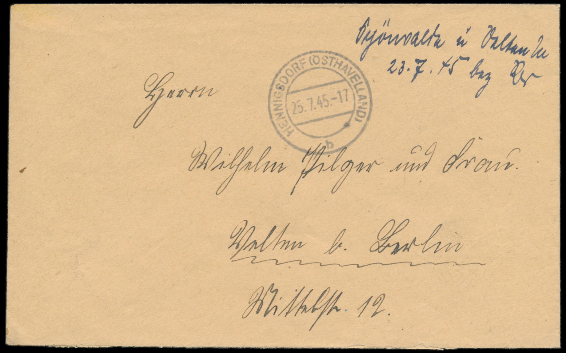 Brief mit sehr seltenem handschriftlichem Aufgabevermerk "Schönwalde über Velten 23.7.45 bez" und Stempel Henningsdorf (Osthavelland) 25.7.45 nach Velten, Handbuch Gruppe 5