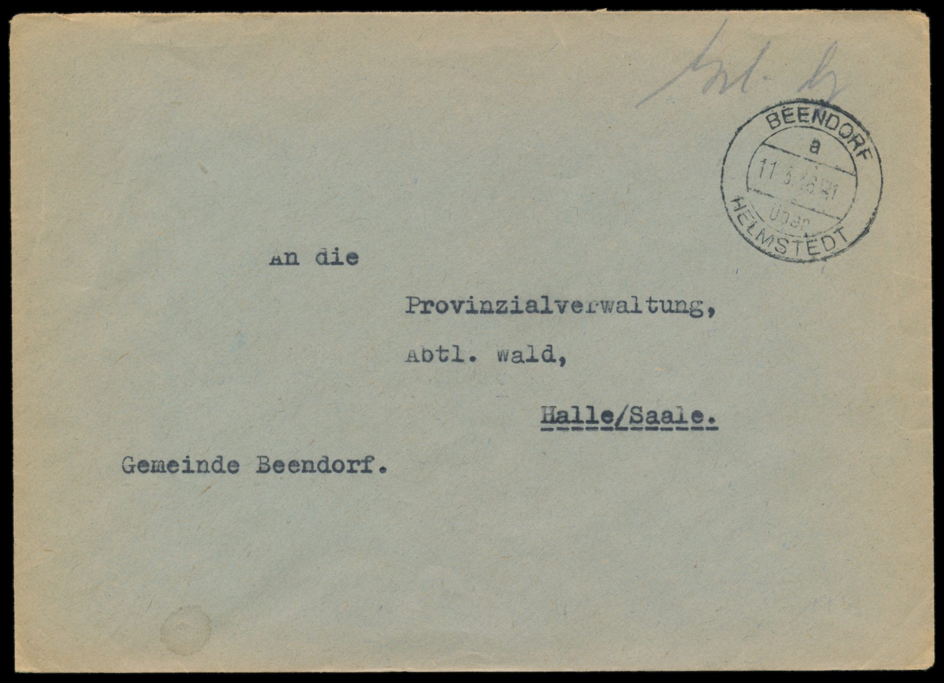 Brief mit Stempel Beendorf über Helmstedt 11.3.46 und handschriftlich "Gebühr bezahlt" nach Halle. Durch einen Gebietswechsel zwischen der Britischen und Sowjetischen Zone kam Beendorf am 1.7.1945 zur SBZ mit neuem Leitpostamt Eilsleben (OPD Magdeburg), hier noch alte Leitort-Bezeichnung Helmstedt