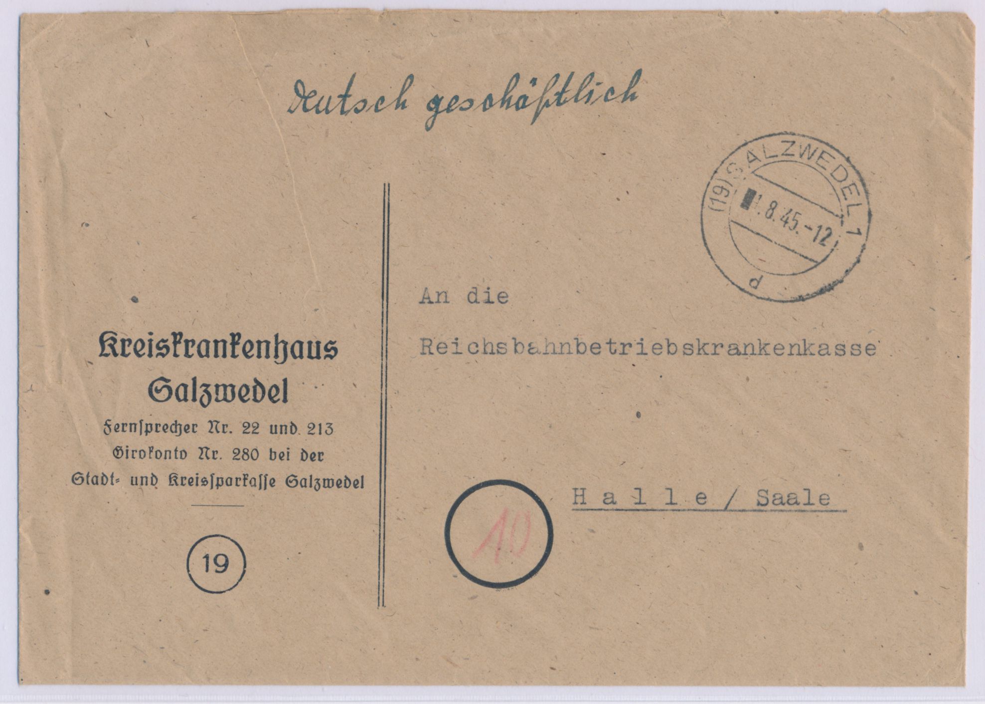 Regierungsbezirk Magdeburg, Behördenbrief mit Stempel Salzwedel 1.8.45 ohne Gebühr bezahlt-Vermerk nach Halle, möglich vom 1.7. bis 4.8.1945
