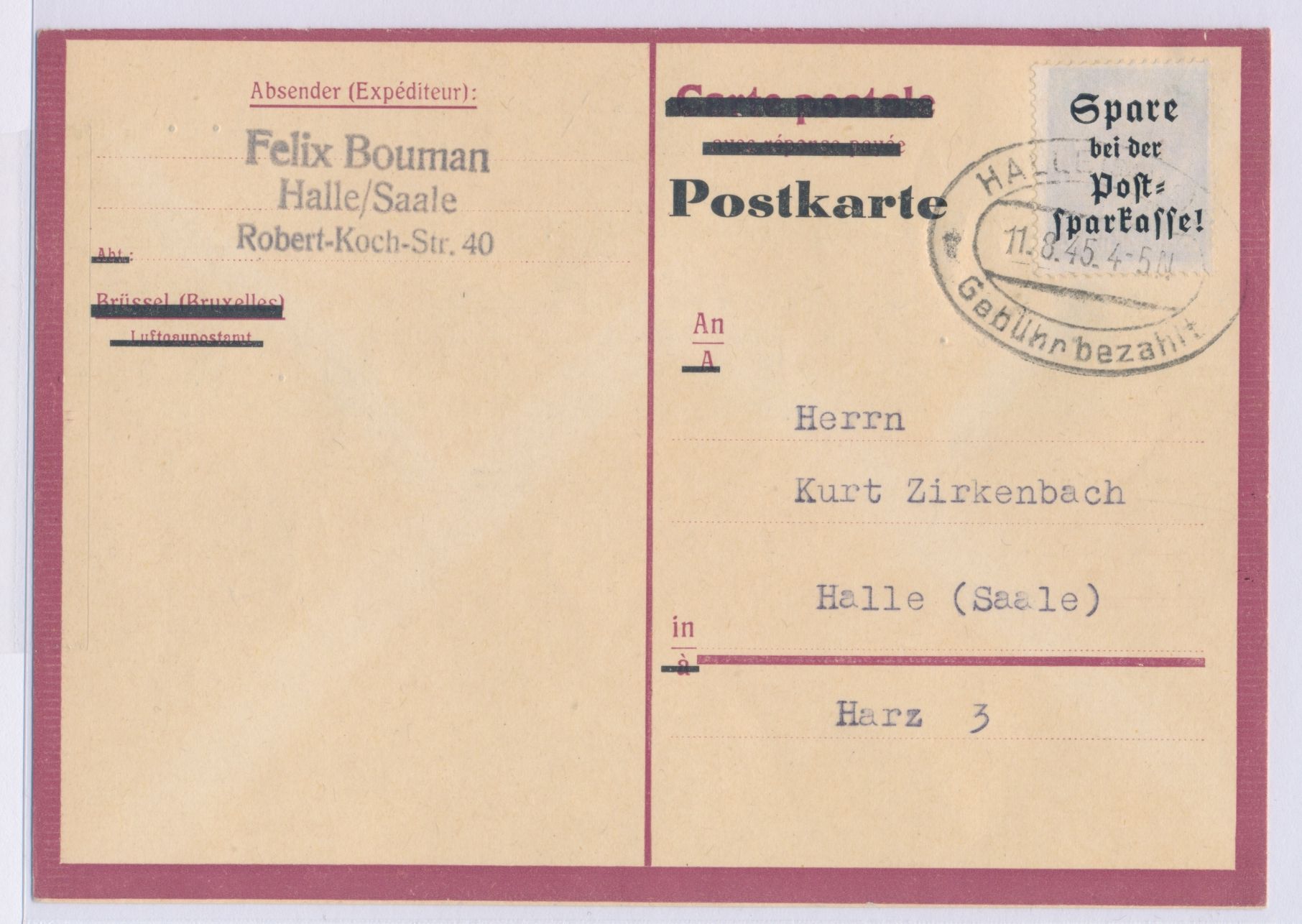 Fremdarbeiter-Ganzsache mit Hindenburg-Wertstempel (P 244), überklebt mit Werbefeld aus Zusammendruck, Stempel Halle (Saale) Gebühr bezahlt 11.8.45, Ortskarte, Bedarf