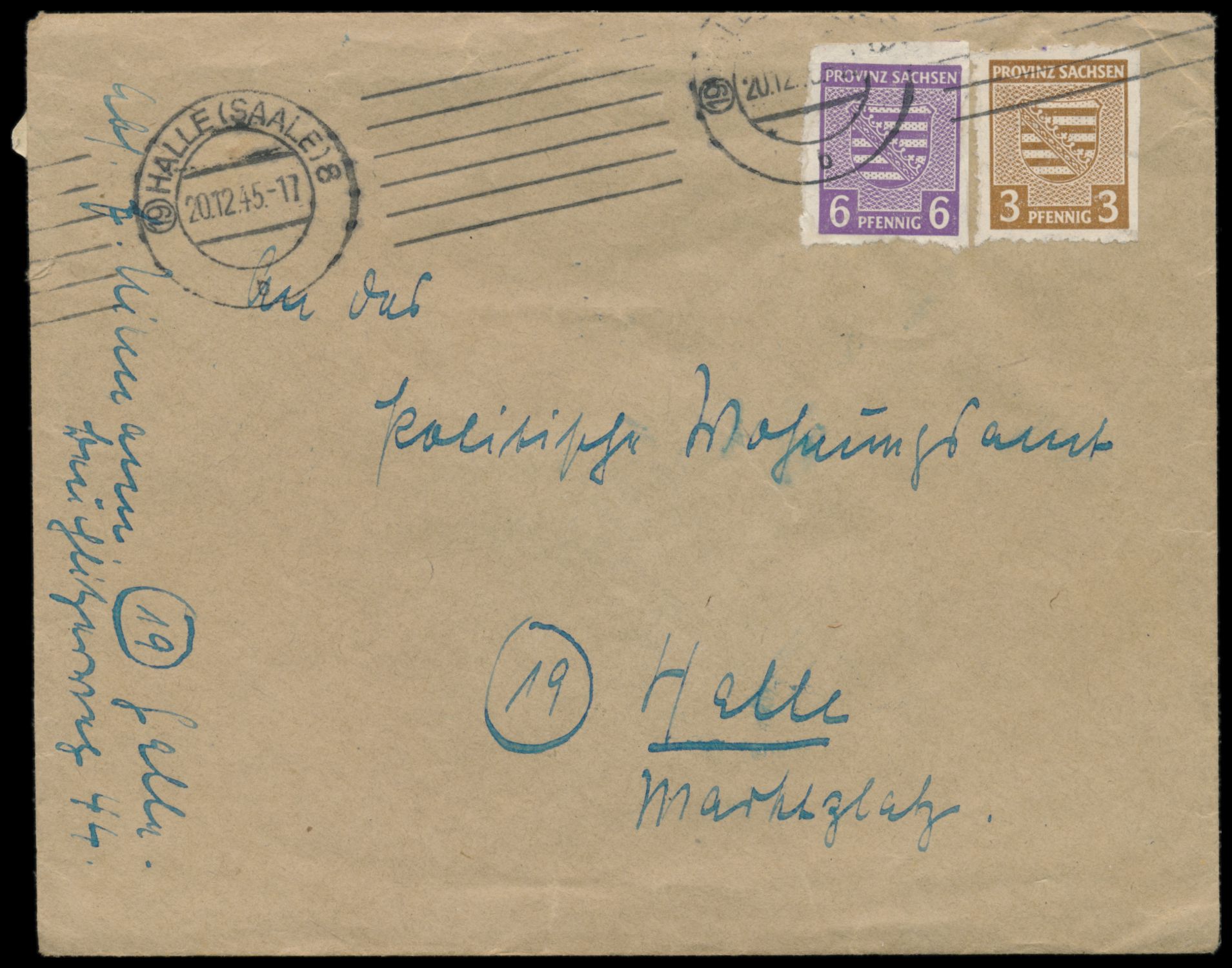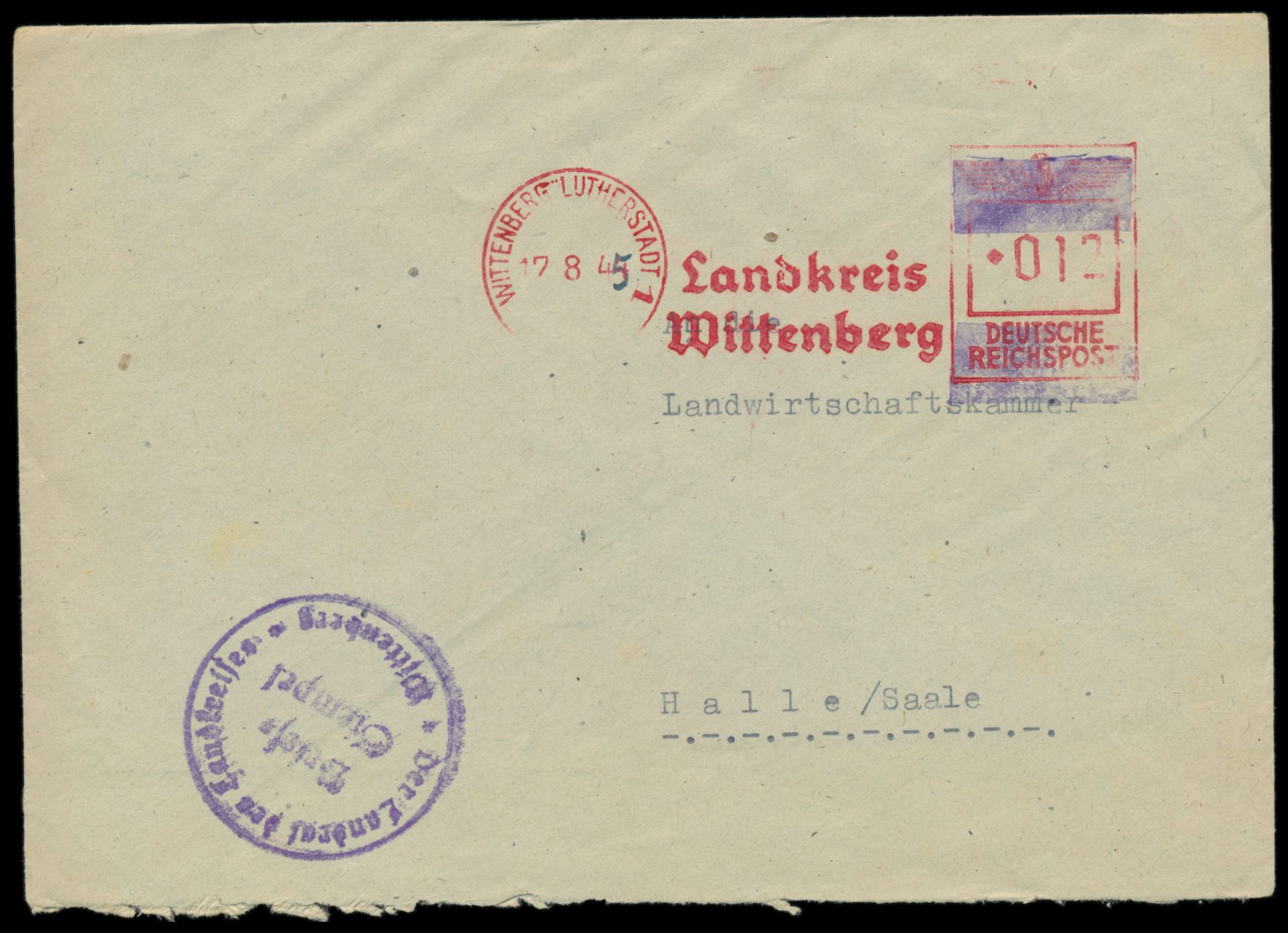 Absenderfreistempel Wittenberg Lutherstadt 1 17.8.45, Landkreis, Reichsadler und Inschrift "Deutsche Reichspost" im Wertrahmen violett überstempelt, Wertziffer 012, nach Halle, Bedarf