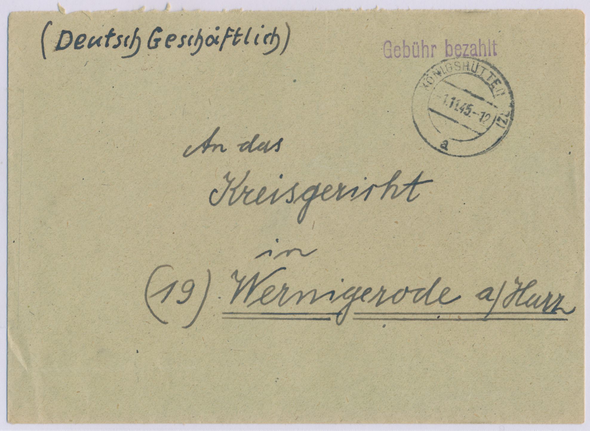 Brief mit Stempel Königshütte (Harz) 1.11.45 und violettem L1 "Gebühr bezahlt" nach Wernigerode. Durch einen Gebietswechsel zwischen der Britischen und Sowjetischen Zone kam Königshütte am 1.7.1945 zur SBZ und damit von der OPD Braunschweig zur OPD Magdeburg