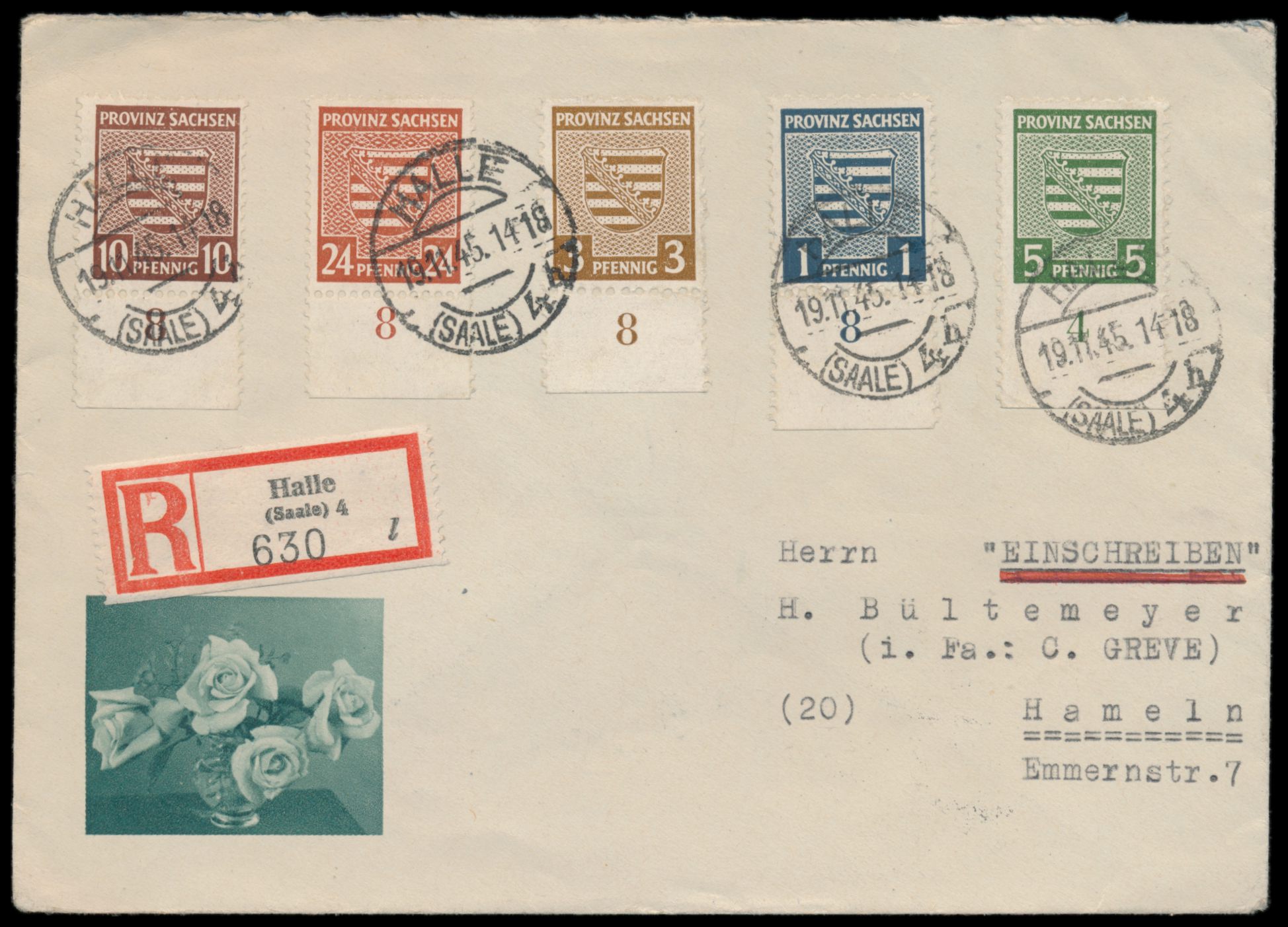 1 Pf., 3 Pf. und 5 Pf. mit Privatzähnung L 11 und 10 Pf. und 24 Pf. (alle mit Unterrand) auf Einschreibbrief, Stempel Halle (Saale) 4 19.11.45, nach Hameln, Ankunftstempel 26.11.45