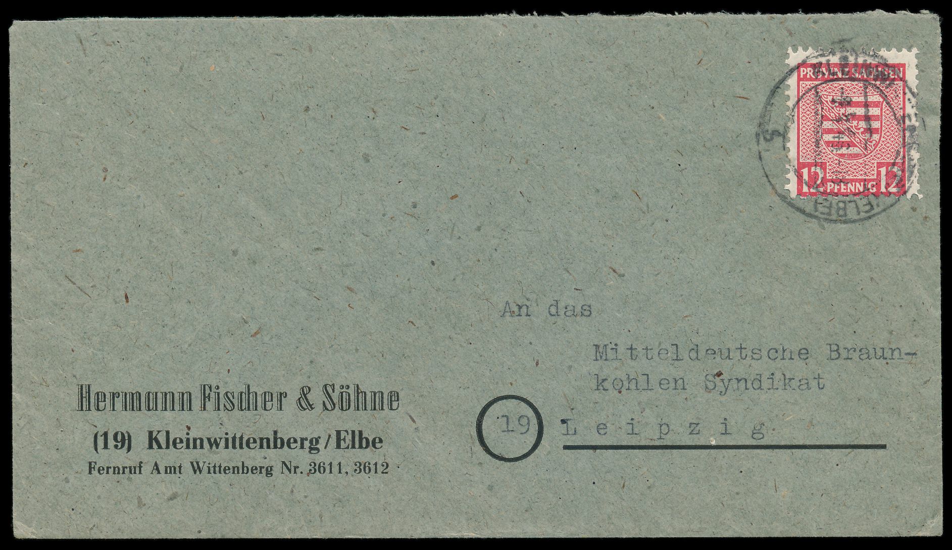 12 Pf. Provinzwappen mit Postmeisterzähnung Wittenberg-Lutherstadt auf Firmenbrief, Stempel Kleinwittenberg (Elbe) 2.1.46, nach Leipzig, Bedarf, geprüft Dr. Jasch BPP