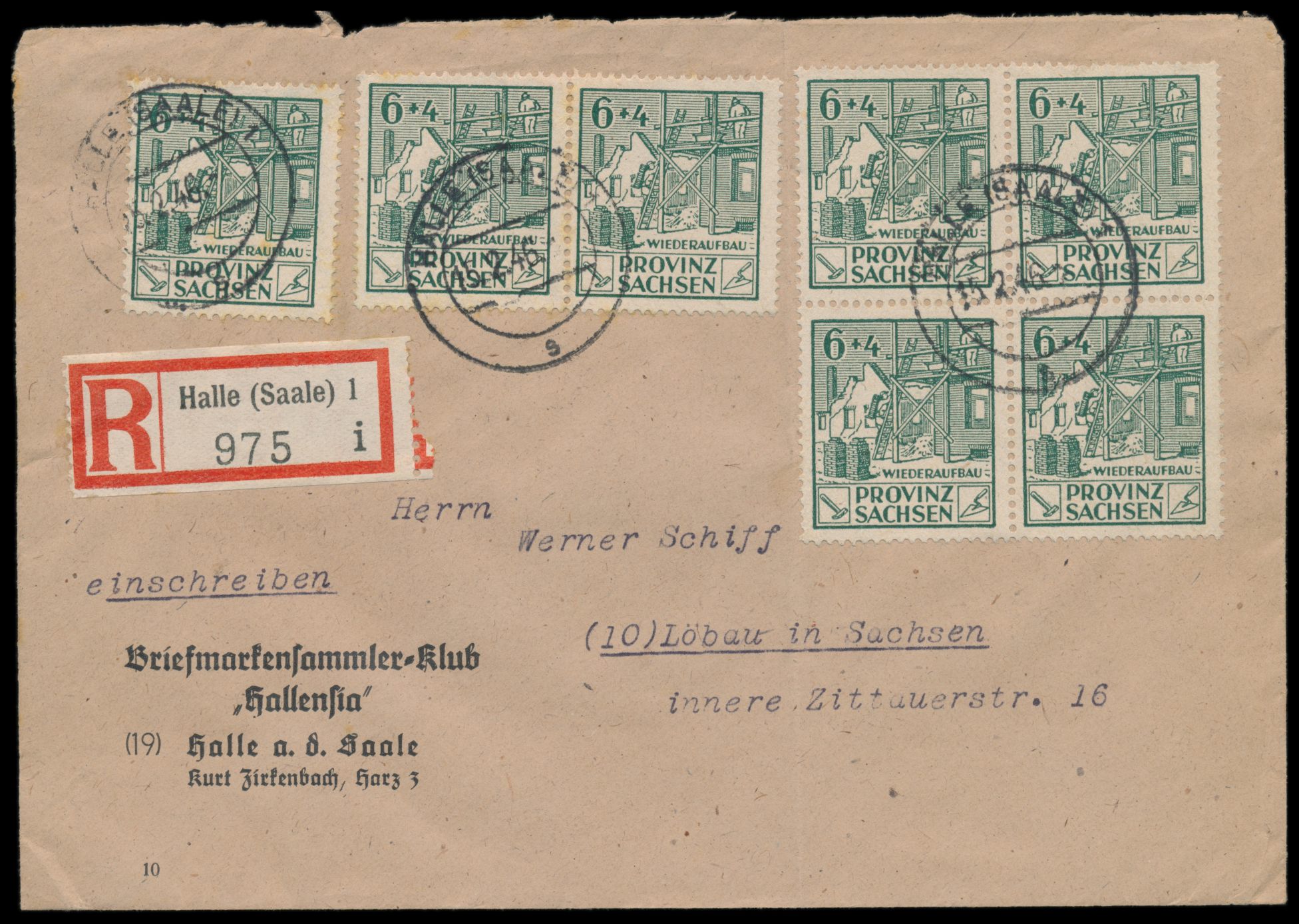 7 x 6 + 4 Pf. Wiederaufbau auf Einschreibbrief mit Stempel Halle (Saale) 1 15.2.46 nach Löbau, linke Marke mit seltenem Plattenfehler "Schraffurlinien in Wertziffer 6 fehlend", Ankunftstempel 18.2.46, portorichtig, schwacher senkrechter Bug zwischen der Frankatur