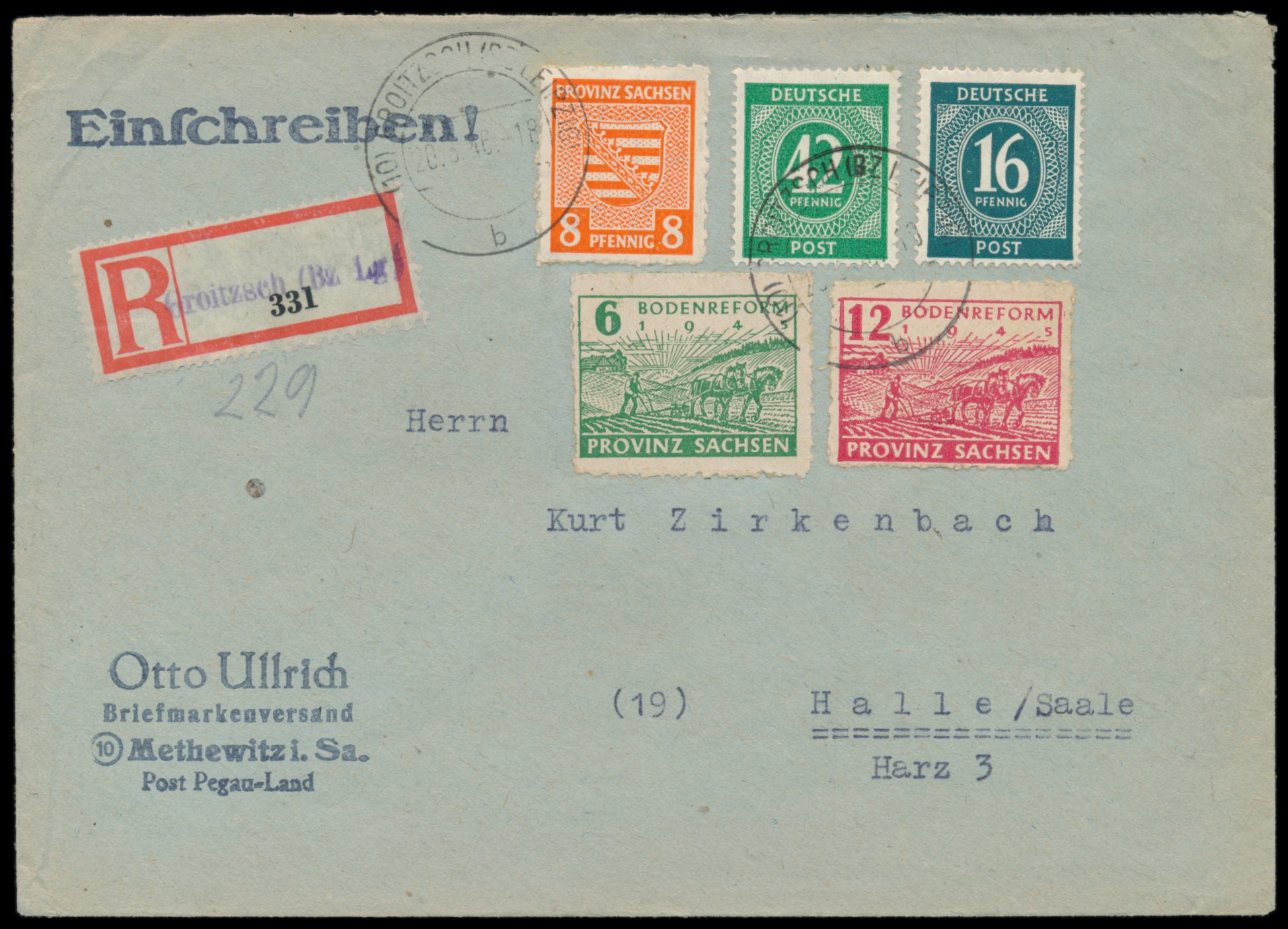 8 Pf. Wappen, 6 Pf. und 12 Pf. Bodenreform mit Privatdurchstich und 16 Pf. und 42 Pf. Ziffer auf Einschreibbrief, Stempel Groitzsch (Bz. Leipzig) 20.3.46, nach Halle, Absender Briefmarkenversand Otto Ullrich in Methewitz, Ankunftstempel 22.4.46