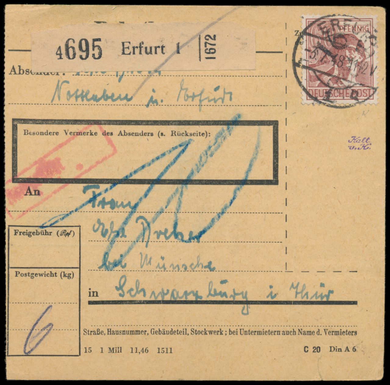 Bezirkshandstempel 16 Erfurt Land auf 60 Pf. auf Paketkarte, Stempel Erfurt 1 3.7.48, nach Schwarzburg, roter R1 Nachgebühr, handschriftlich 10 Pf., handschriftlicher Zustellvermerk 5.7.