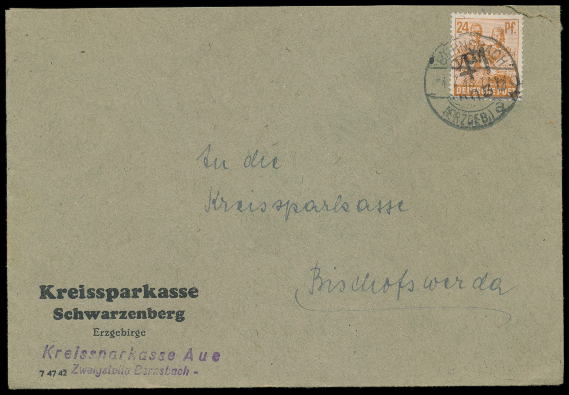 24 Pf. mit seltenem Bezirkshandstempel 41 Bernsbach auf Brief der Kreissparkasse Aue / Zweigstelle Bernsbach, Stempel Bernsbach (Erzgeb) a 4.7.48, nach Bischofswerda, Bedarf