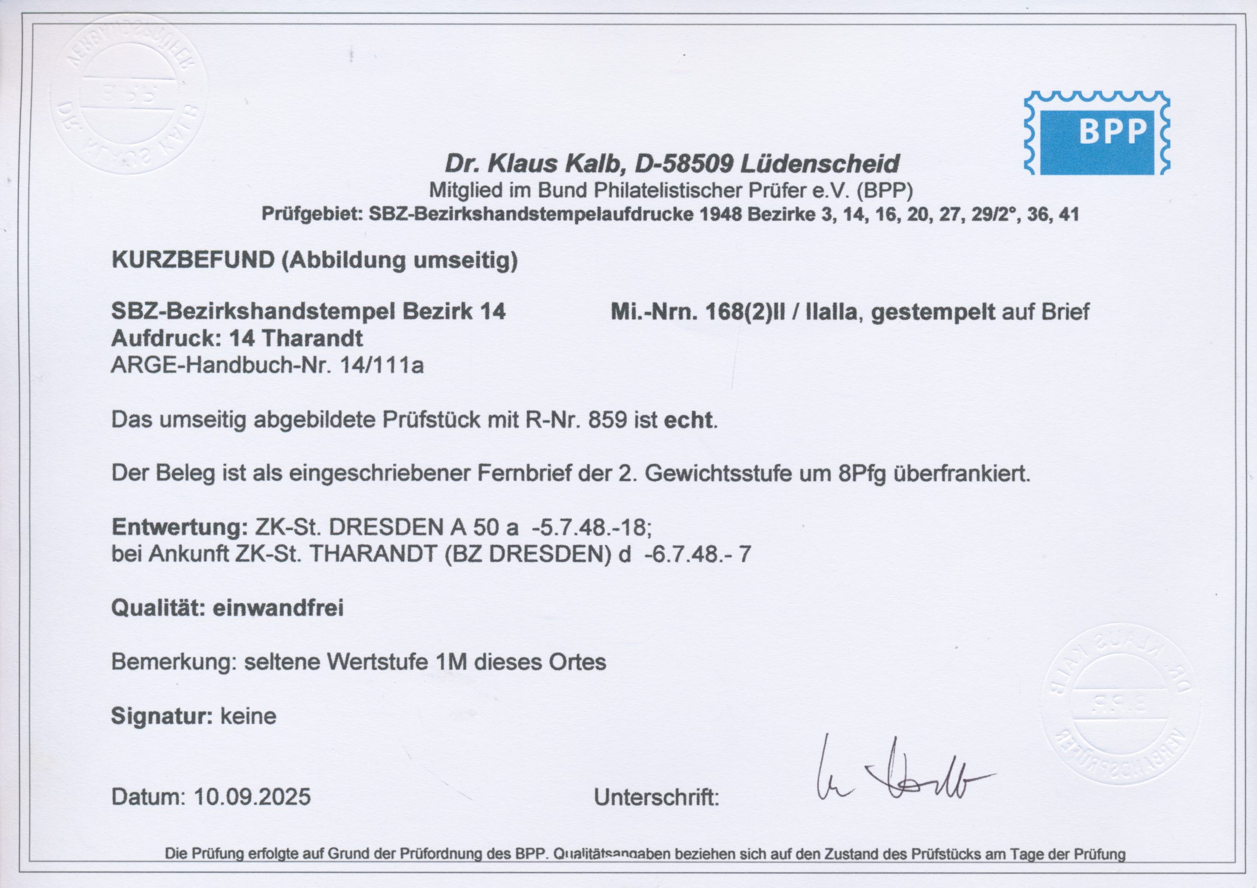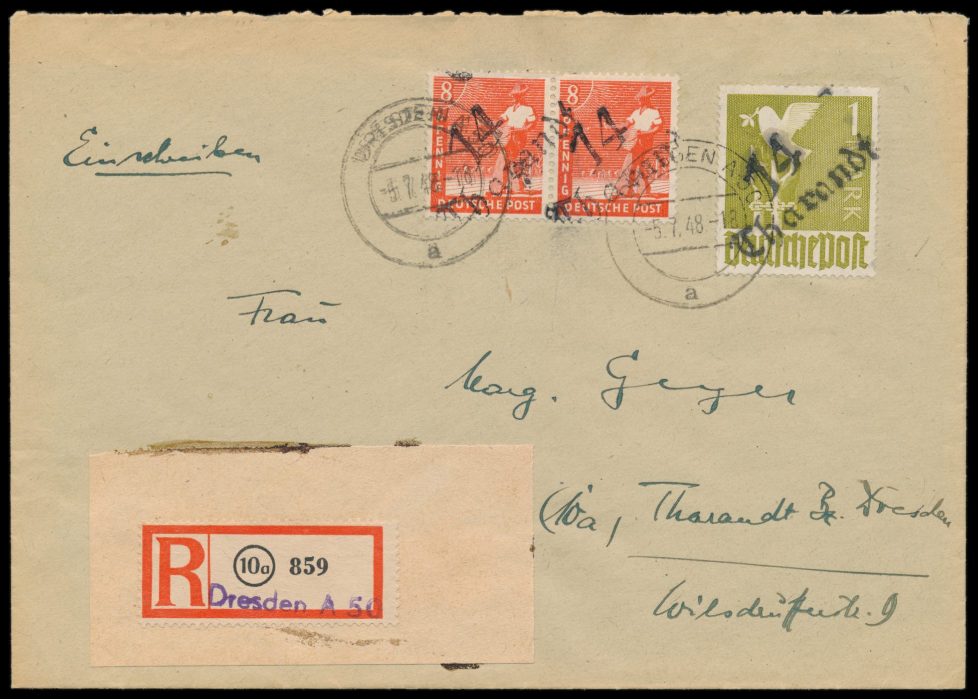 2 x 8 Pf. und 1 Mark Taube mit Bezirkshandstempel 14 Tharandt auf Einschreibbrief mit Stempel Dresden A 50 5.7.48 nach Tharandt, Ankunftstempel 6.7.48, Befund Dr. Kalb BPP "echt und einwandfrei, seltene Wertstufe 1 M. dieses Ortes ", Brief ist 8 Pf. überfrankiert