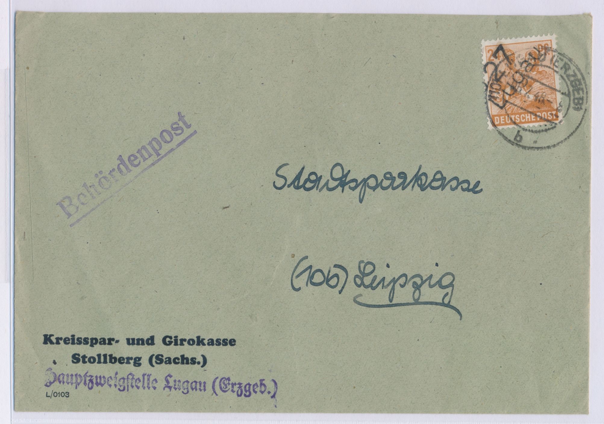 Bezirkshandstempel b 27 Lugau auf 24 Pf. auf Brief der "Kreisspar- und Girokasse Stollberg (Sachs.)" mit Stempel Lugau (Erzgeb) 6.7.48 nach Leipzig, L1 "Behördenpost", Bedarf