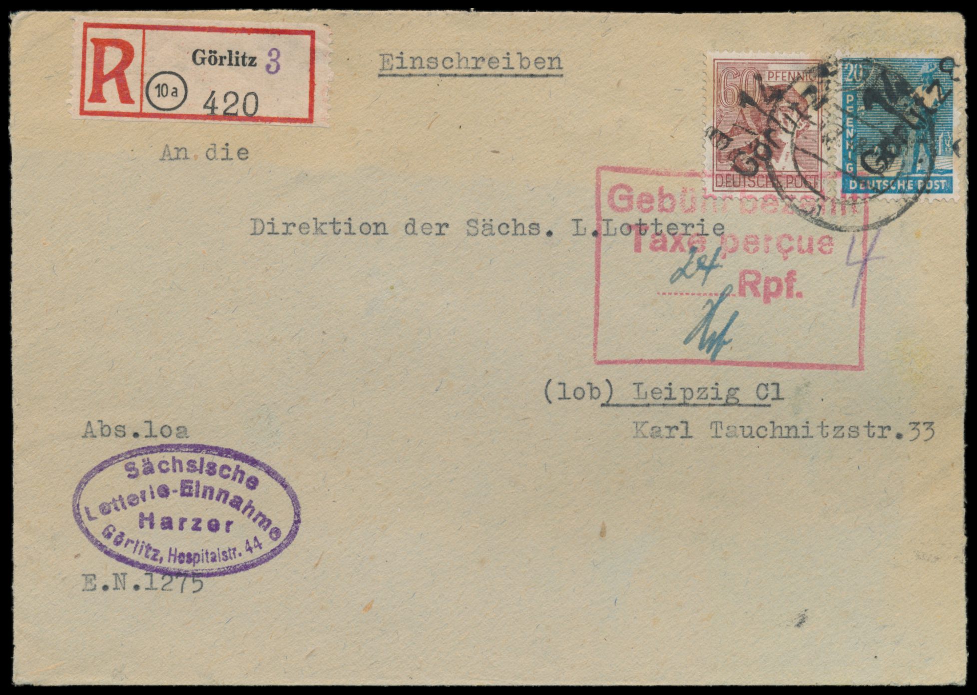 Bezirkshandstempel 14 Görlitz 8 auf 20 Pf. und a 14 Görlitz 1 mit großem roten Stempel Gebühr bezahlt / Taxe percue / ... Rpf., irrtümlich falsche Gebühr 24 Pf., als Teilbarfrankatur auf Einschreibbrief nach Leipzig, Stempel Görlitz 3 7.7.48, Ankunftstempel 9.7.48, Umschlag ist dreiseitig offen, Bedarf