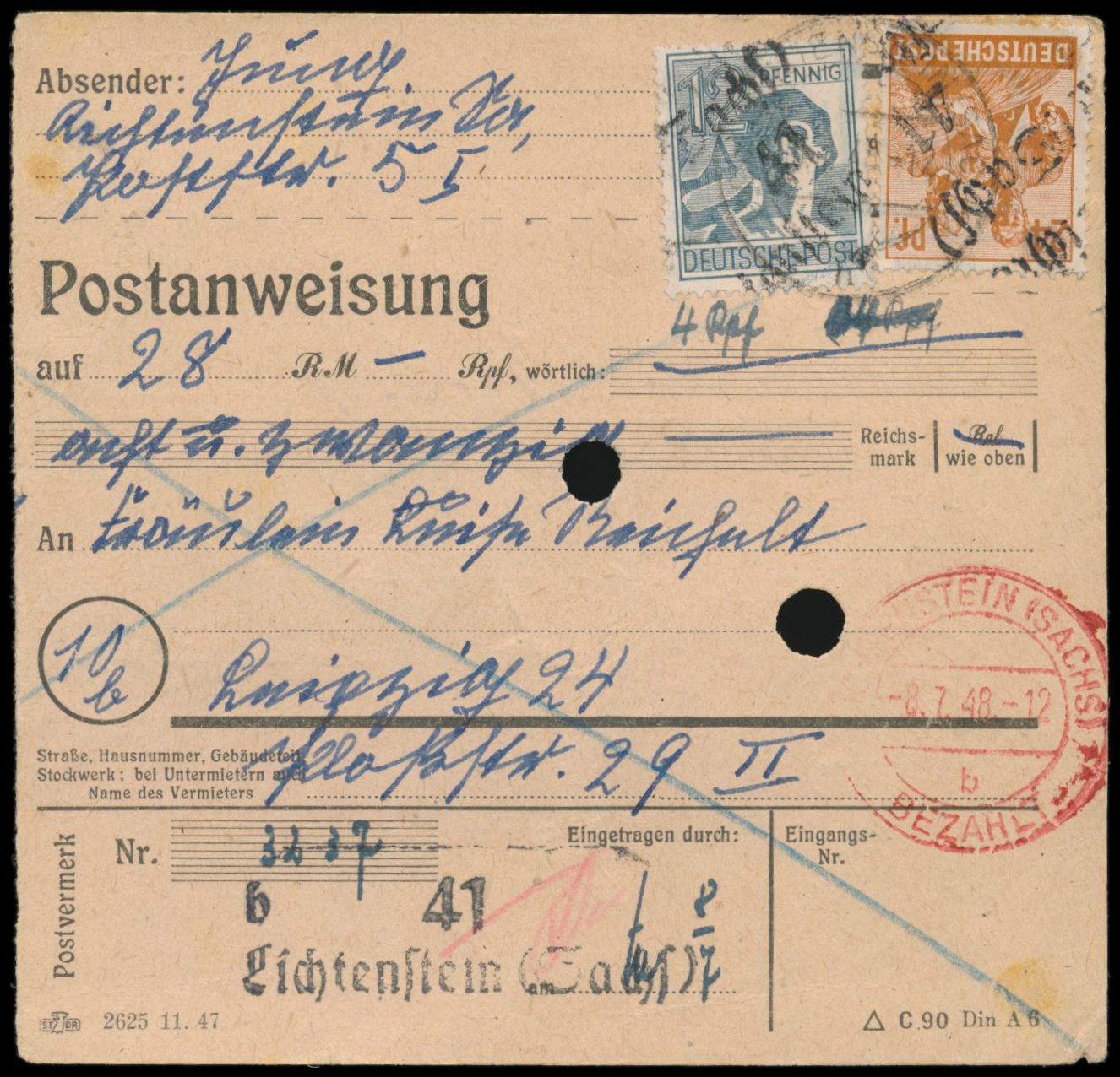 Bezirkshandstempel b 41 Lichtenstein (Sachs) auf 12 Pf. und 24 Pf. auf Postanweisung auf 28 Mark nach Leipzig, Stempel Lichtenstein (Sachs) 8.7.48 und roter Stempel Lichtenstein (Sachs) Bezahlt 8.7.48, handschriftlich 4 Pf., Ankunftstempel 10.7.48. Teilbarfrankaturen auf Postanweisungen sind sehr selten