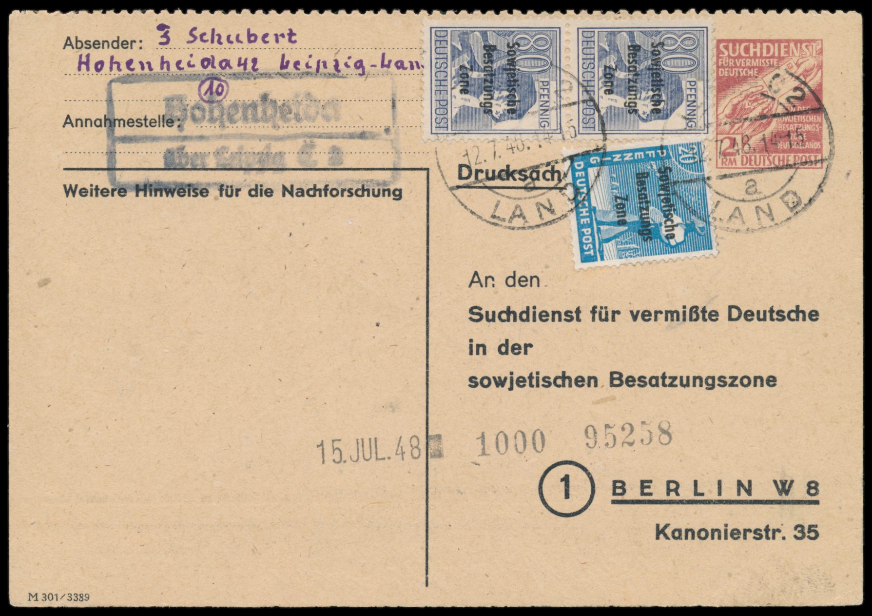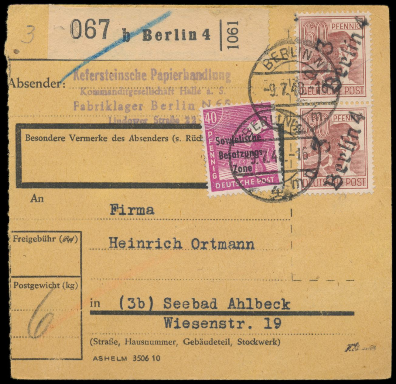 Bezirkshandstempel a 3 Berlin 4 auf 60 Pf. im senkrechten Paar mit 40 Pf. Maschinen-Aufdruck auf Paketkarte, Stempel Berlin NW 4 9.7.48, nach Seebad Ahlbeck