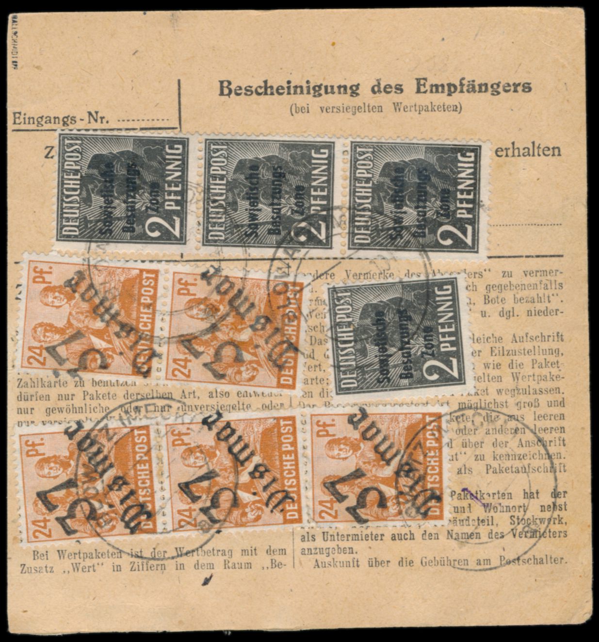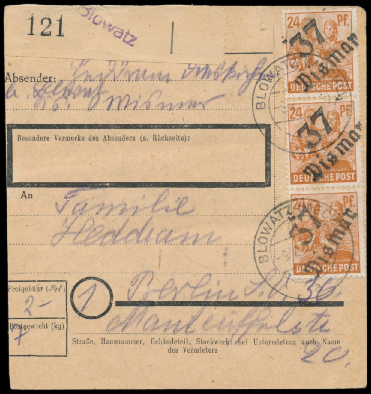 8 x 24 Pf. mit Bezirkshandstempel 37 Wismar und 4 x 2 Pf. SBZ-Maschinenaufdruck beidseitig auf Paketkarte für ein Paket von 7 kg nach Berlin SO 36 (West-Berlin), Stempel Blowatz (Meckl) 9.7.48