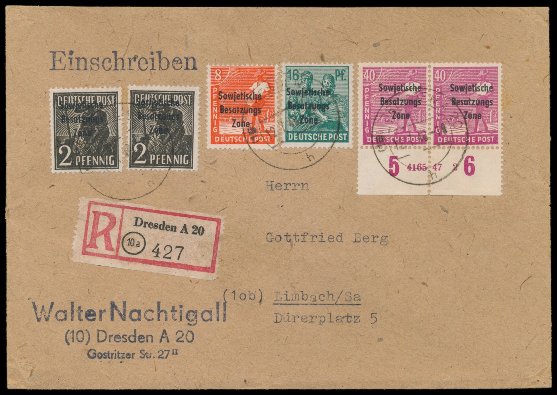 40 Pf. Maschinenaufdruck im waagerechten Unterrandpaar mit HAN 4165-47 2 zusammen mit 2 x 2 Pf., 8 Pf. und 16 Pf. als portorichtiger Einschreibbrief 2. Gewicht, Stempel Dresden A 20 12.7.48, nach Limbach, Ankunftstempel 14.7.48, MiPr. 300