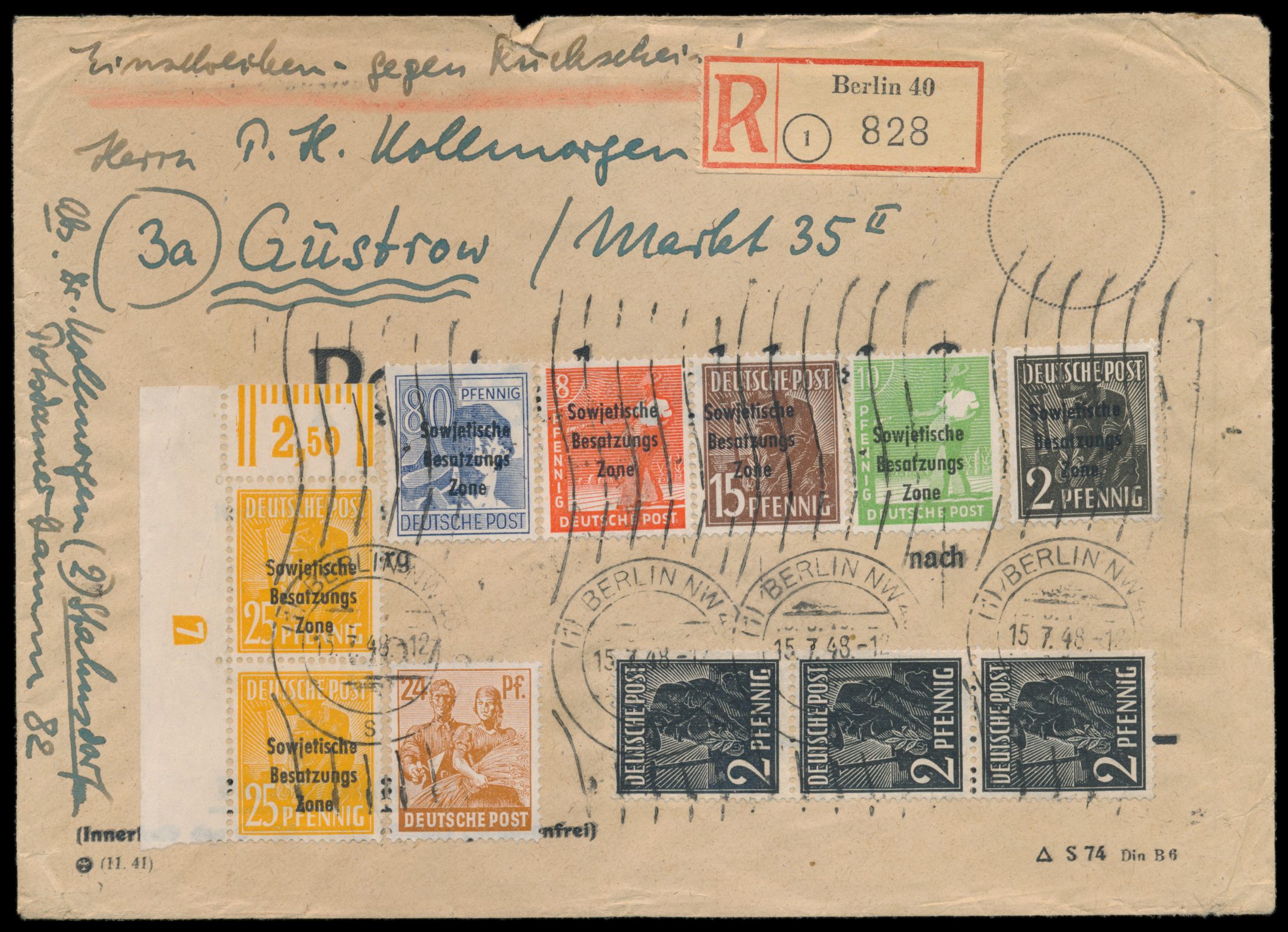 25 Pf. Maschinenaufdruck im senkrechten Eckrandpaar mit Druckerzeichen 7 (negativ) in 10fach-Mischfrankatur auf Einschreiben-Rückschein-Brief 2. Gewicht, Handrollstempel Berlin NW 40 15.7.48 (West-Berlin), nach Güstrow, Ankunftstempel 19.7.48, exakt portorichtig 168 Pf., Bedarf, MiPr. -.-