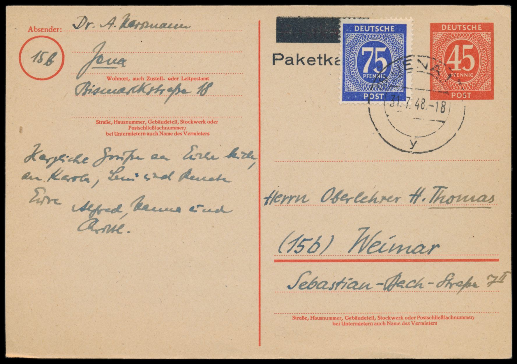 Ganzsache 45 Pf. Ziffer mit Überdruck "Paketkarte" , Zusatzfrankatur 75 Pf. Ziffer, Stempel Jena 1 31.7.48, als Zehnfachfrankatur (Letzttag) nach Weimar, Bedarf