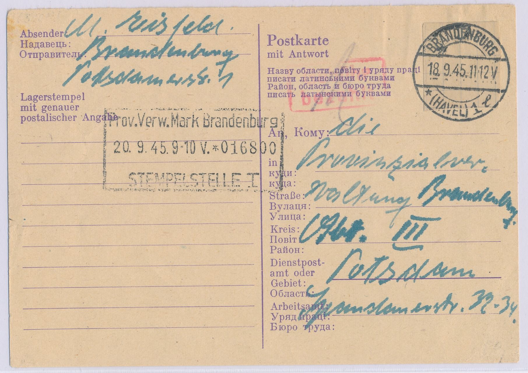 Ostarbeiter-Ganzsache (Frageteil) mit überklebtem Hitlerkopf-Wertstempel, Stempel Brandenburg (Havel) 1 18.9.45 und roter R2 Gebühr bezahlt, nach Potsdam, Behörden-Eingangsstempel 20.9.45, Bedarf