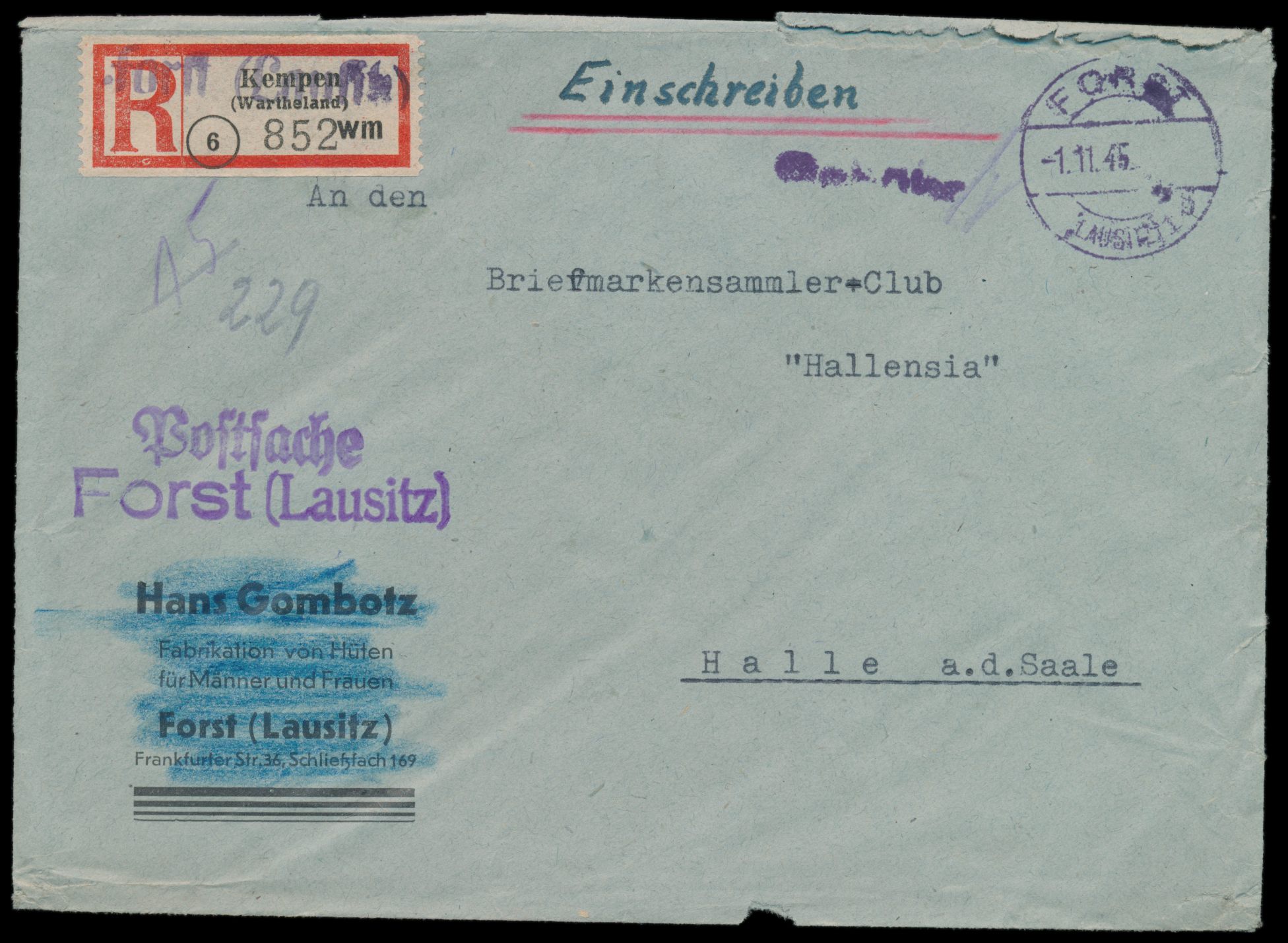 Einschreibbrief mit Stempel Forst (Lausitz) 1 1.11.45 und L1 "Gebühr" nach Halle, R-Zettel (6) Kempen (Wartheland) mit Selbstbucherkennzeichen wm , mit Formularstempel "Forst (Lausitz) überstempelt, Ankunftstempel 4.11.45, Umschlag ist oben etwas unsauber geöffnet, Bedarf