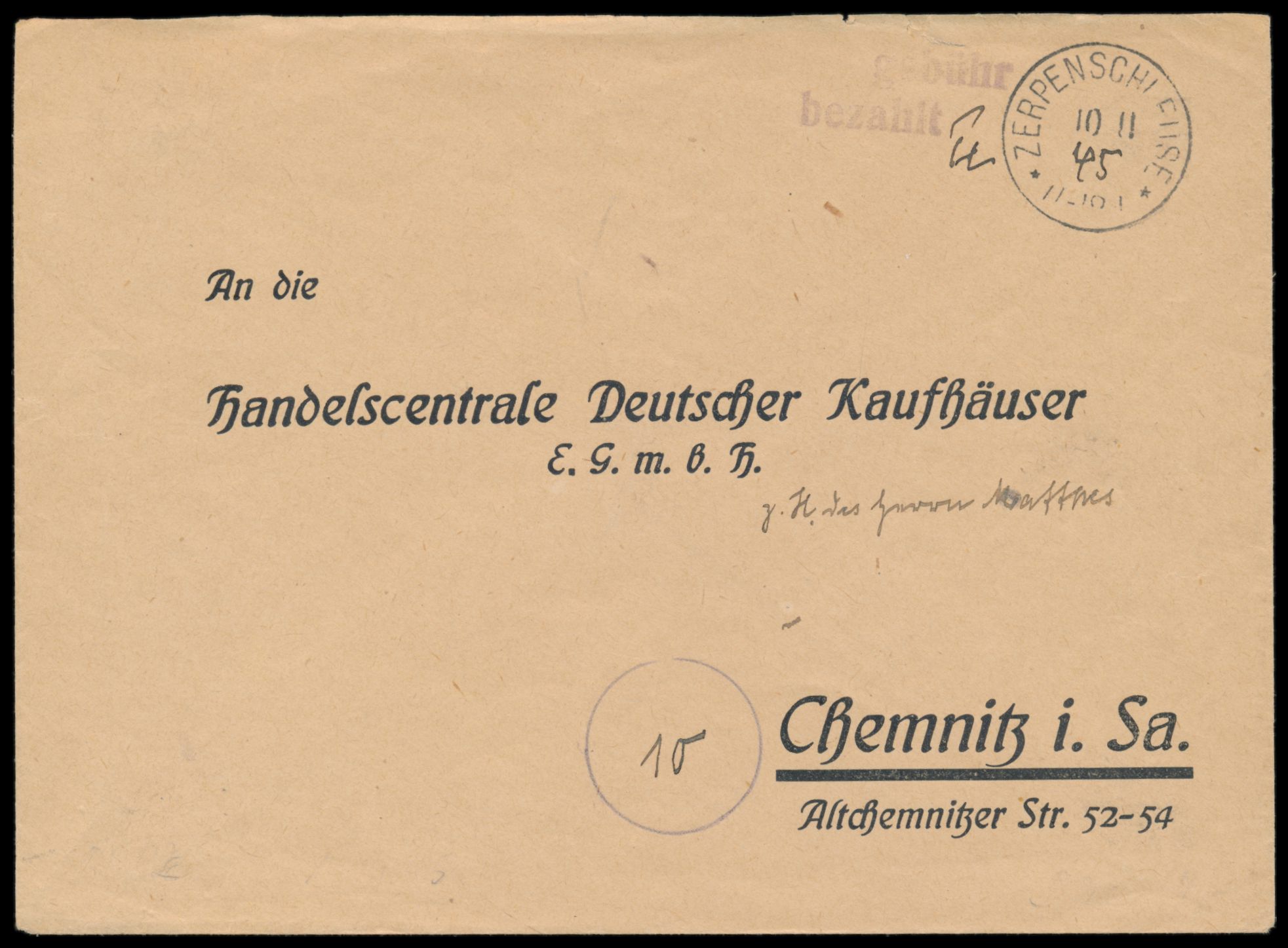 alter Reichspost-K1 Zerpenschleuse 10.11.45 (Jahreszahl handschriftlich) und violetter L2 "gebühr bezahlt" auf Brief nach Chemnitz, Umschlag ist oben gering beschnitten, Bedarf