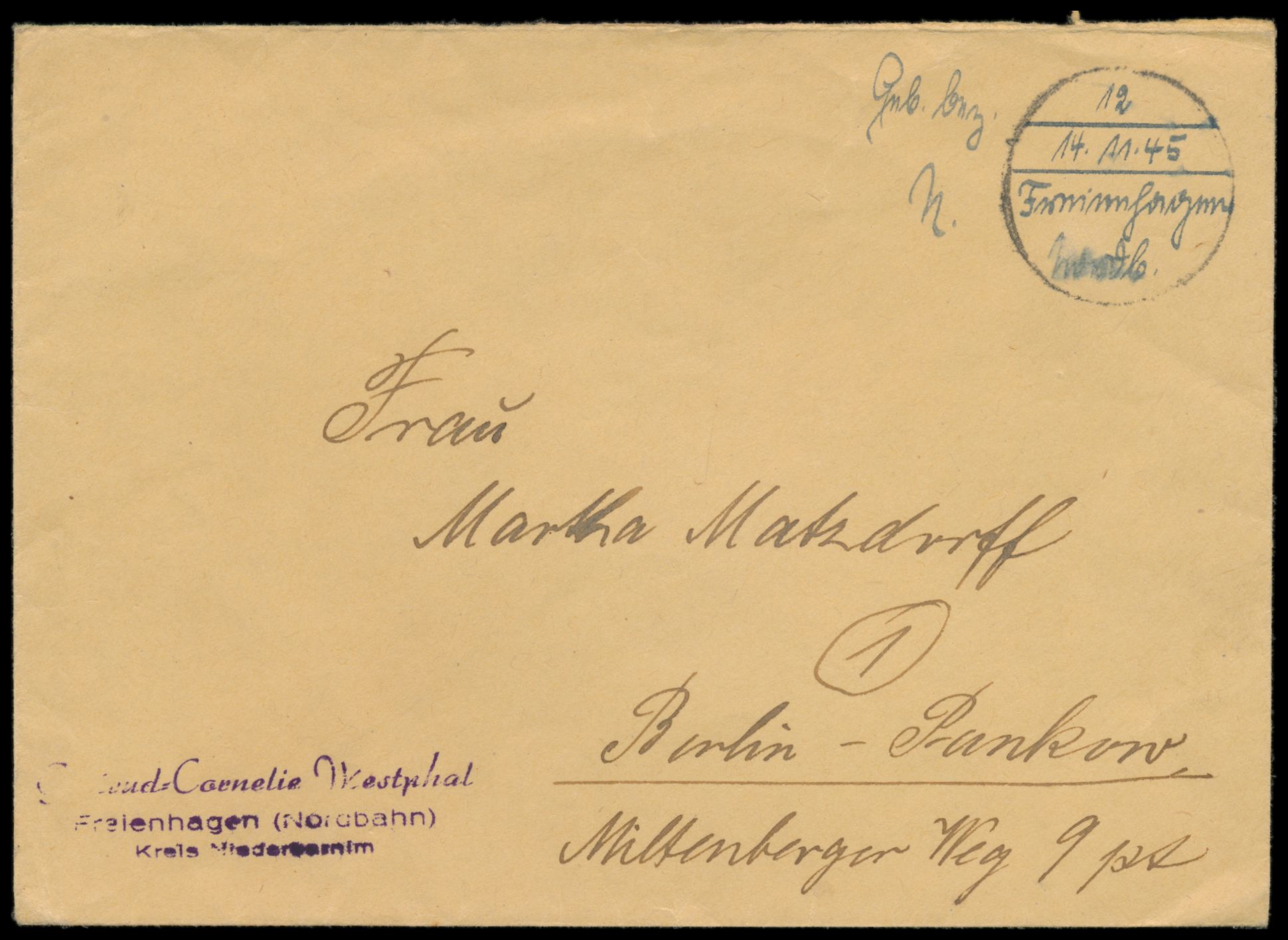 Kreisstempel und handschriftlicher Aufgabevermerk Freienhagen Nordb. 14.11.45 Geb. bez. 12 Pf. auf Brief nach Berlin-Pankow, Handbuch Typ a, Bedarf