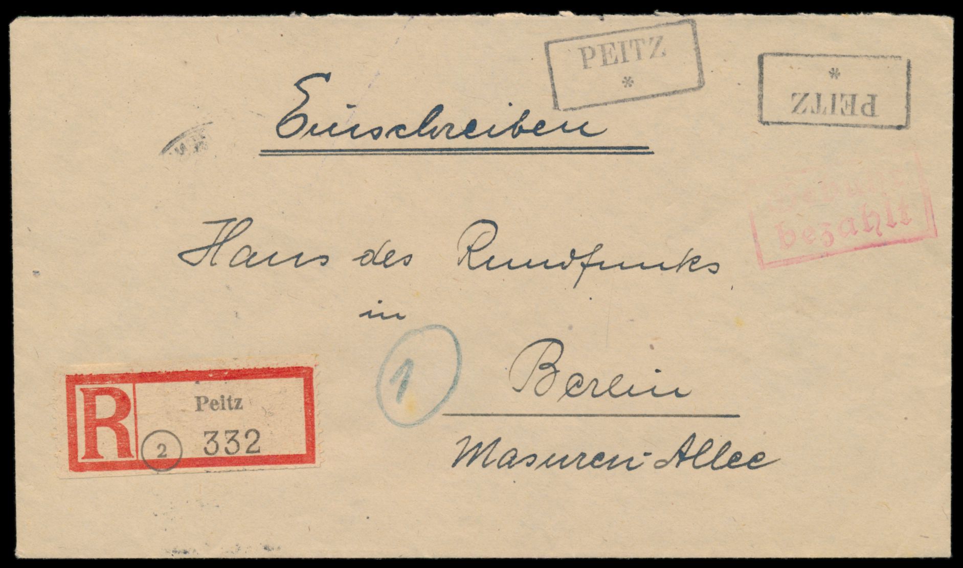 2 x wiederverwendeter Preußen-R2 Peitz ohne Datum und roter R2 Gebühr bezahlt auf Einschreibbrief nach Berlin, rückseitig Absenderstempel "Der Bürgermeister der Stadt Peitz", Bedarf