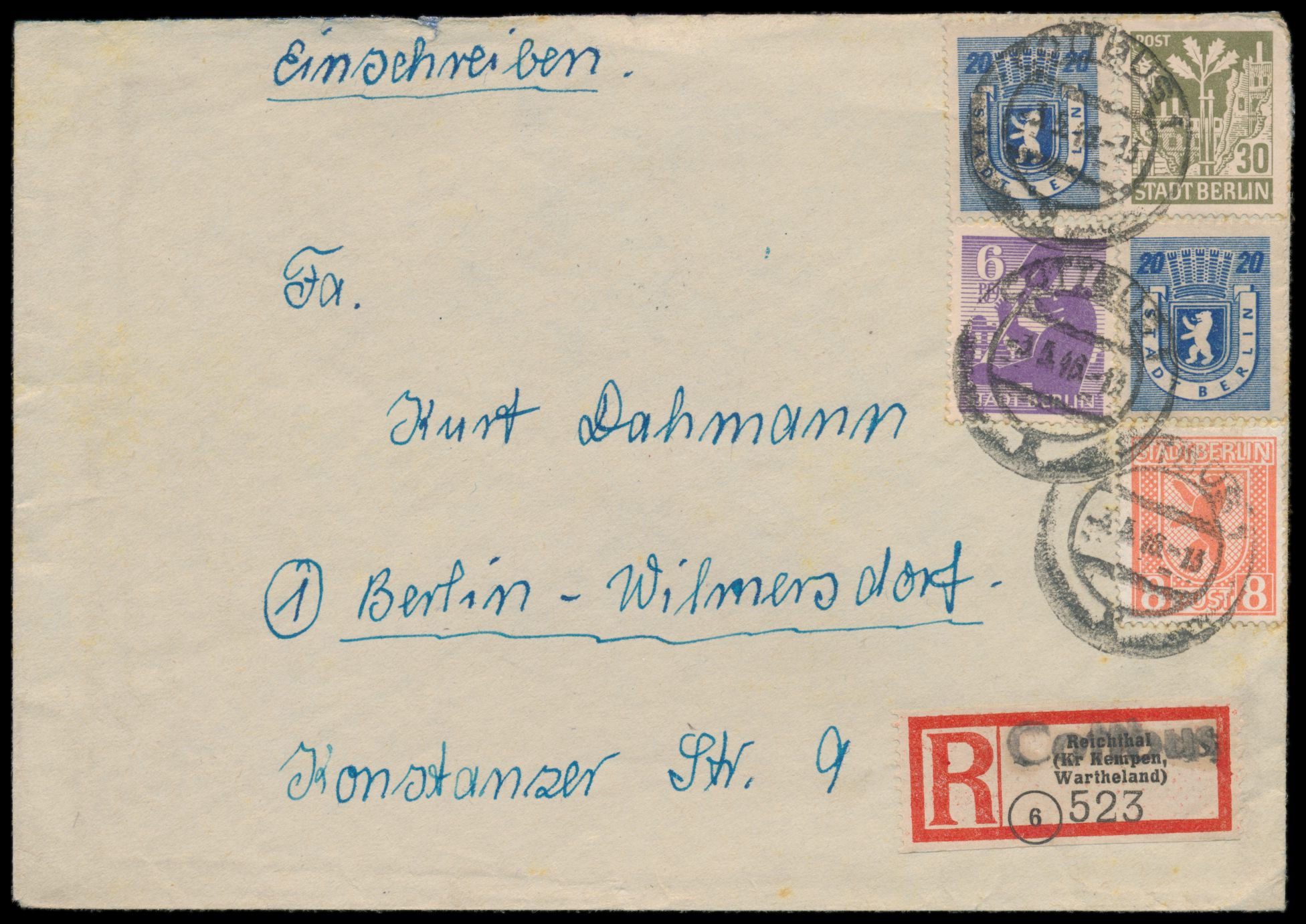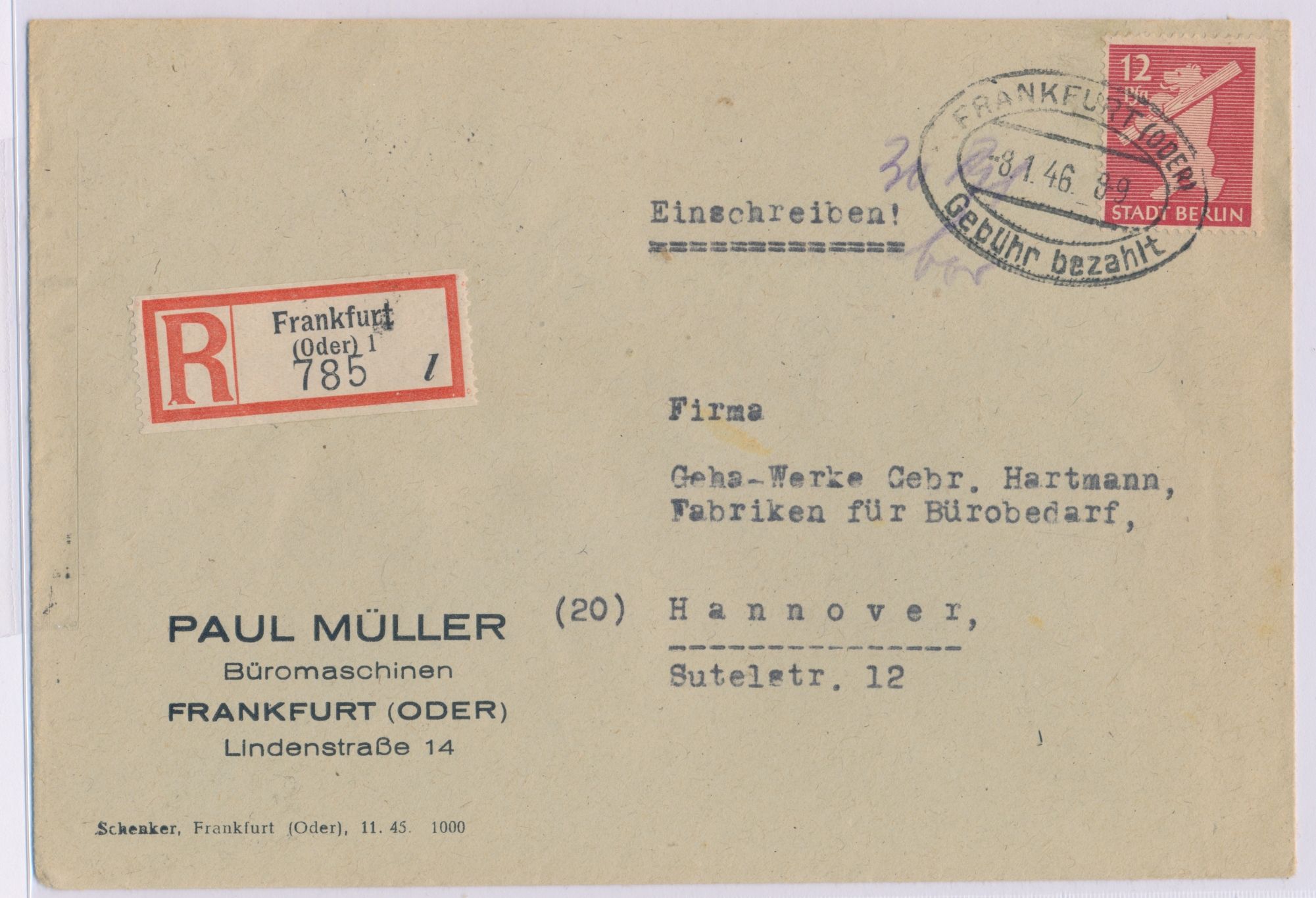 12 Pf. Bär mit Stempel Frankfurt (Oder) Gebühr bezahlt 8.1.46 und handschriftlich "30 Pf. bar" als Teilbarfrankatur auf Einschreibbrief nach Hannover, Ankunftstempel 17.1.46, Bedarf