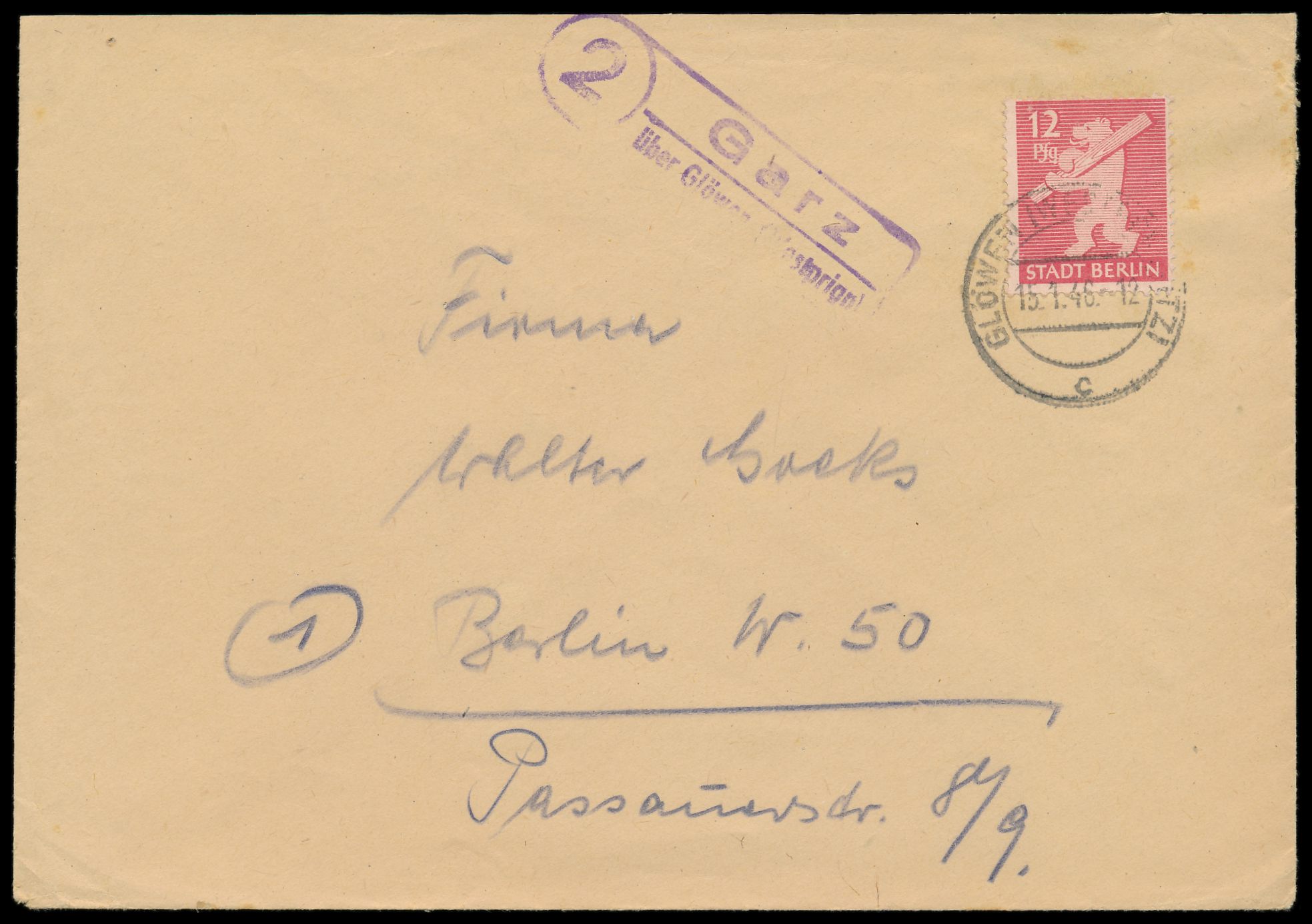12 Pf. Bär auf Brief mit Stempel Glöwen (Westprignitz) 15.1.46 und Aufgabestempel der PSt I (2) Garz über Glöwen (Westprign), Notstempel-Handbuch Typ b, nach Berlin, Bedarf