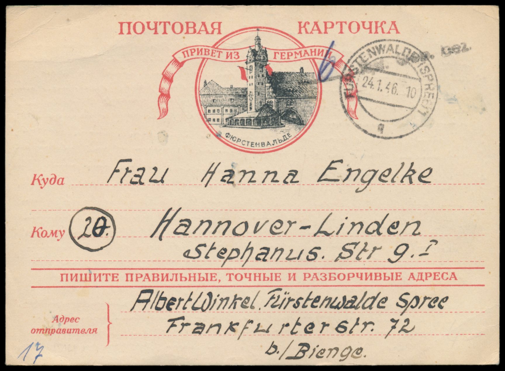Stempel Fürstenwalde (Spree9 1 24.1.46 und schwarzer L1 "... Rpf. Geb. bez." auf russischer Bildkarte "Fürstenwalde" nach Hannover, Bedarf
