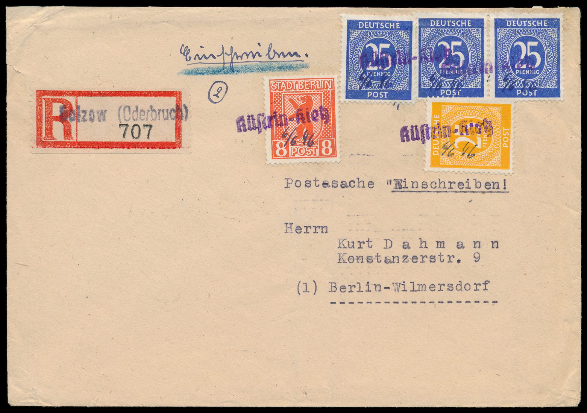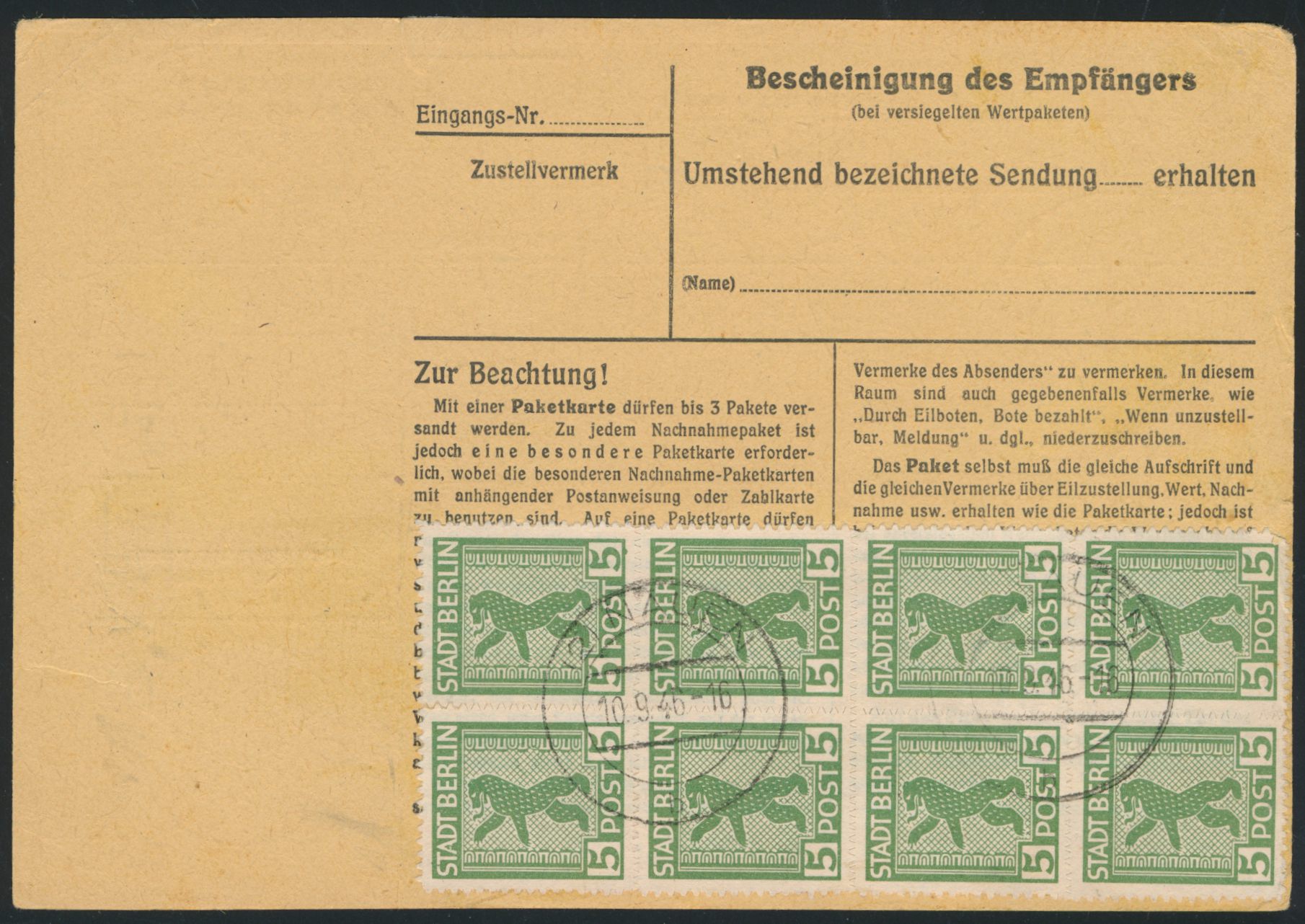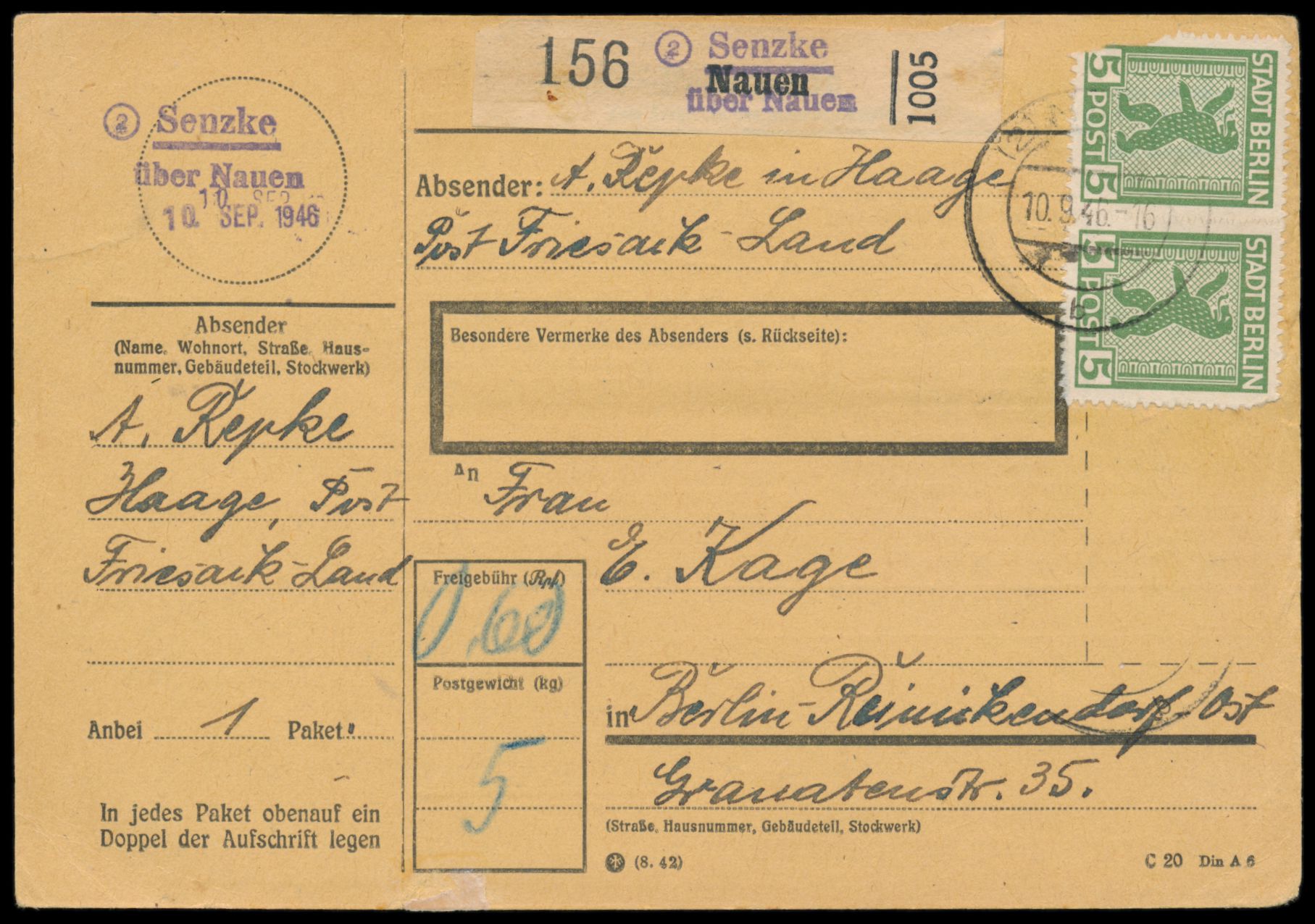 Paar (vorderseitig, kleine Eckfehler) und Achterblock 5 Pf. Bär beidseitig auf Paketkarte, sehr seltener violetter Not-L2 (2) Senzke über Nauen auf Nummernzettel von Nauen und auf Empfängerabschnitt, Frankatur mit Stempel Nauen 10.9.46 entwertet, nach Berlin-Reinickendorf. Senzke war 1944 und 1949 PSt I, bisher unbekannter Notstempel