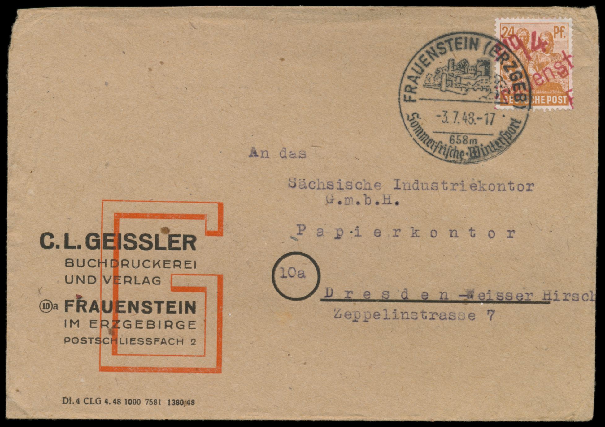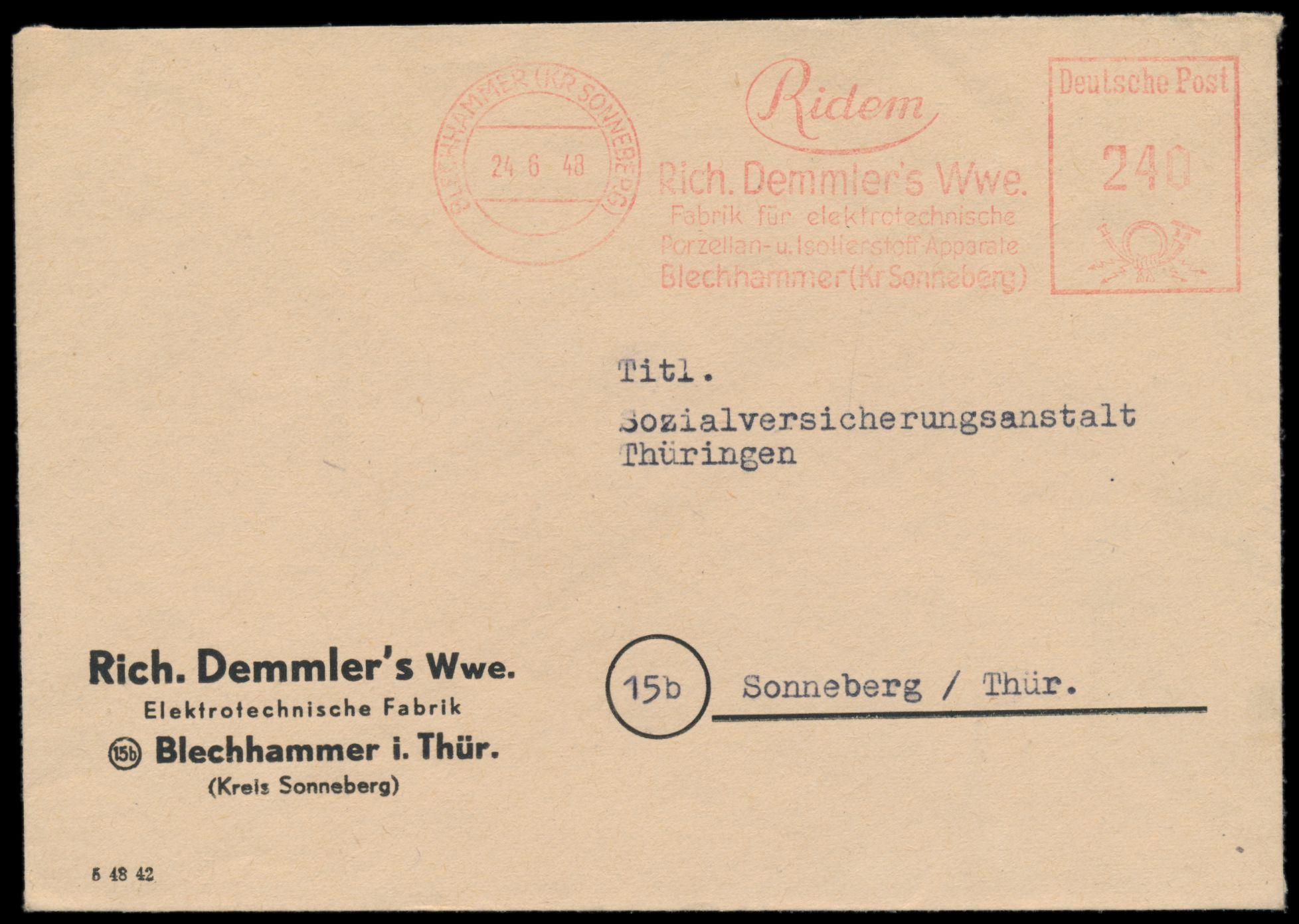 Absenderfreistempel "Ridem - Rich. Demmler´s Witwe", Blechhammer (Kr, Sonneberg) 24.6.48, Posthorn-Wertrahmen mit Zehnfach-Wertstellung 240 Pf., Brief vom Ersttag der Währungsreform nach Sonneberg, Bedarf